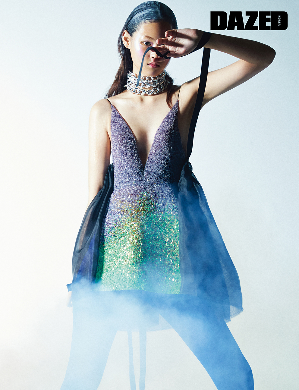 글리터 장식 보디 폼 미니드레스와 체인 초커는 제르마니에(Germanier), 스타킹은 에디터의 것.
