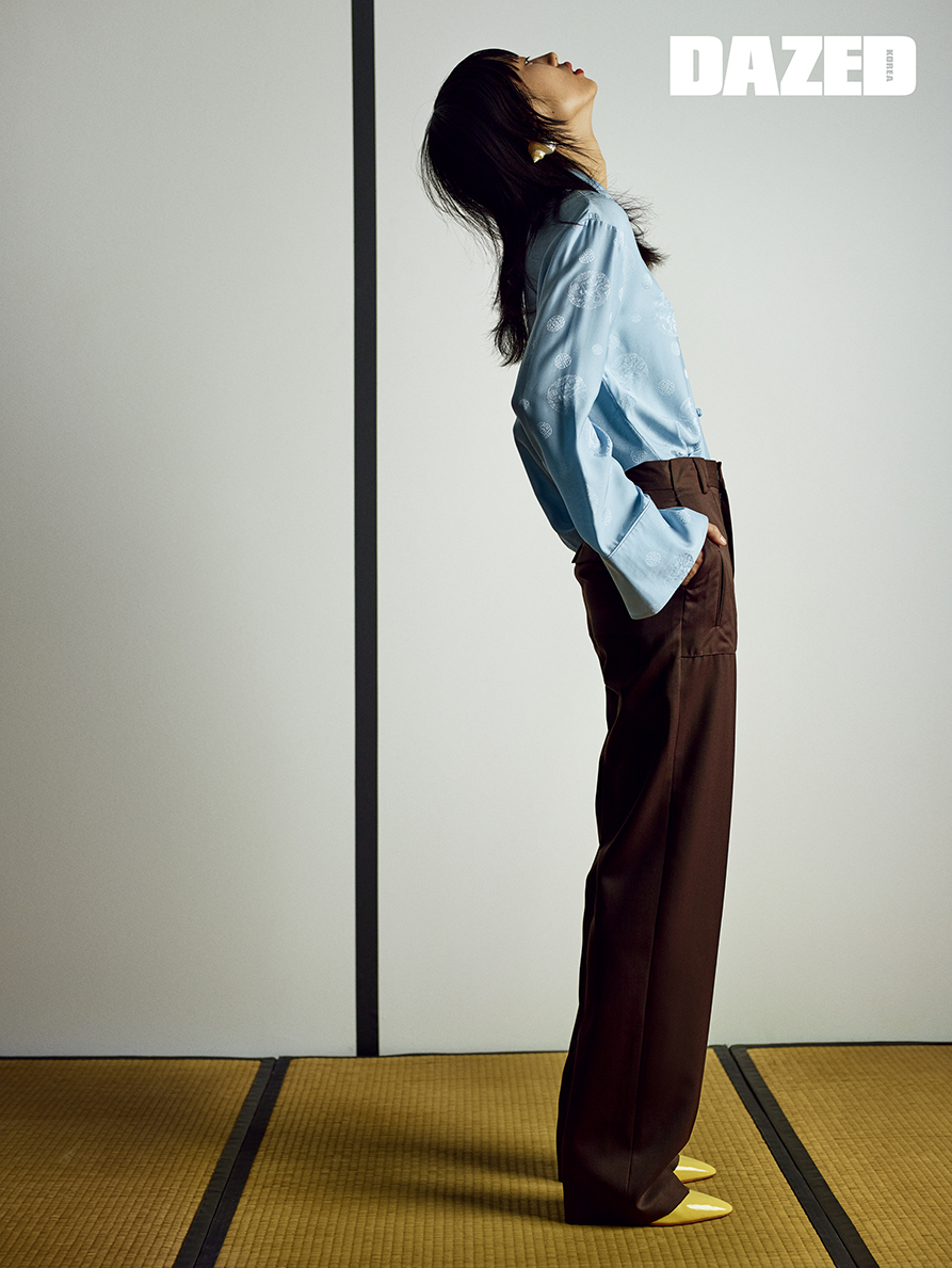 셔츠는 알렉산더 왕(Alexander Wang), 팬츠는 커미션 엔와이씨(Commision.nyc), 이어링은 루이니(Luiny), 샛노란 스틸레토 힐은 마리앰 나시르 자데(Maryam Nassir Zadeh).
