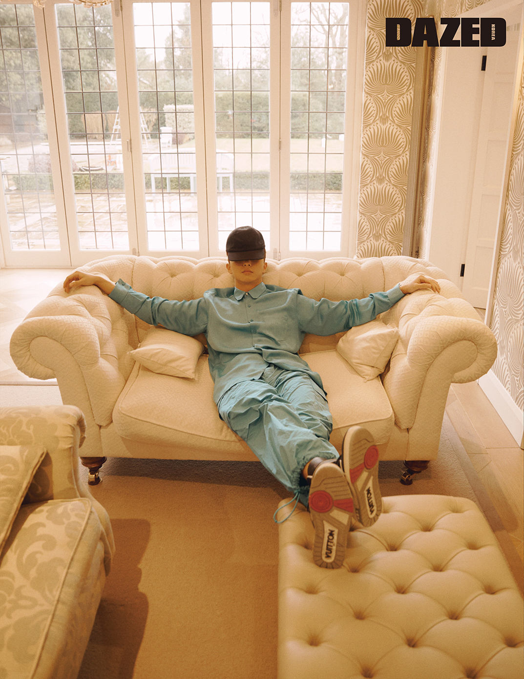 블루 컬러 셔츠와 팬츠, 스니커즈는 모두 루이 비통(Louis Vuitton).