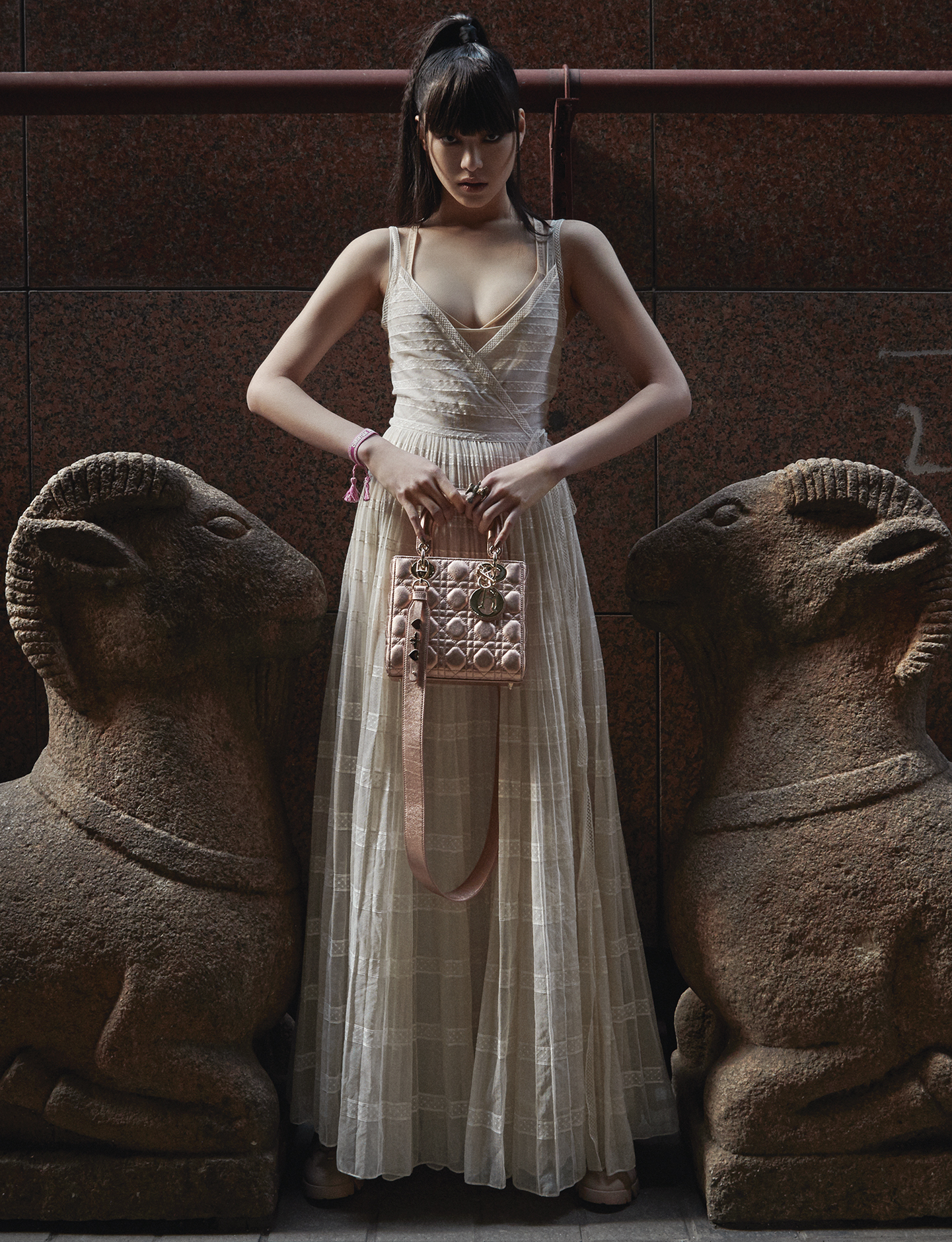 새 모양 메탈 링, 로고를 새긴 자수 팔찌, 그리고 양옆에 둔 레이디 디올 백은 모두 디올(Dior).