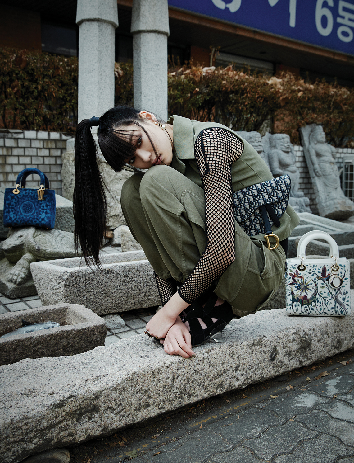 카키색 베스트와 팬츠, 이너로 입은 메시 소재 점프슈트, 허리에 두른 오블리크 자수 패턴의 새들 벨트 백, 레이스업 샌들 힐, 진주 이어링,