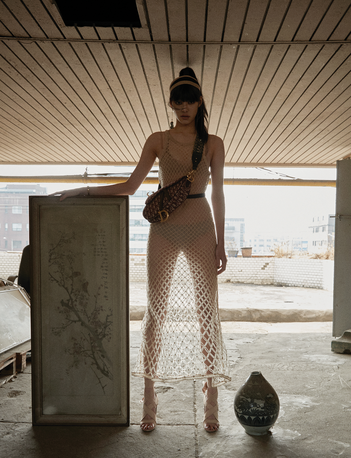 메시 소재 드레스, 이너로 입은 보디슈트, 브라톱과 브리프, 오블리코 자수 패턴의 새들 백과 스트랩, 벨트, 글라스 힐이 달린 레이스업 샌들 힐,