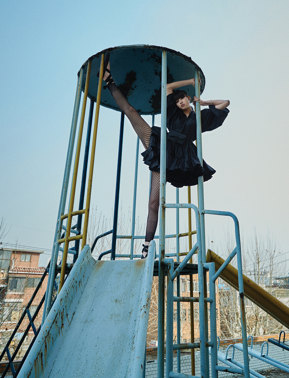 벨 라인 미니드레스와 이너로 입은 메시 소재 점프 슈트, 레이스업 발레리나 플래슈즈, 벨트 파우치와 브레이슬릿은 모두 디올(Dior).