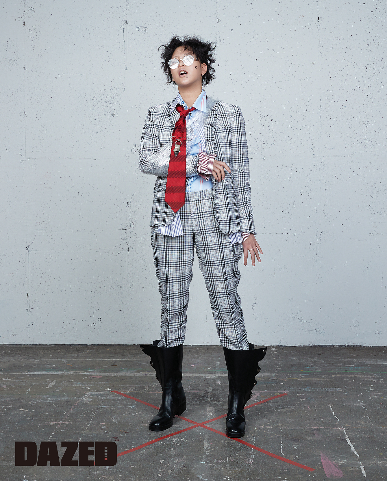 Bartley by Matchesfashion.com), 안에 입은 하늘색 셔츠는 비비안 웨스트우드(Vivienne Westwood), 앵클부츠는 크리스챤 디올(Christian Dior), 실버 아이웨어는 톰 브라운(Thom Browne), 타이는 인턴 에디터가 할아버지께 물려받은 것, 타이 위에 매치한 아프리칸 브로치는 램섀클(Ramshackle).