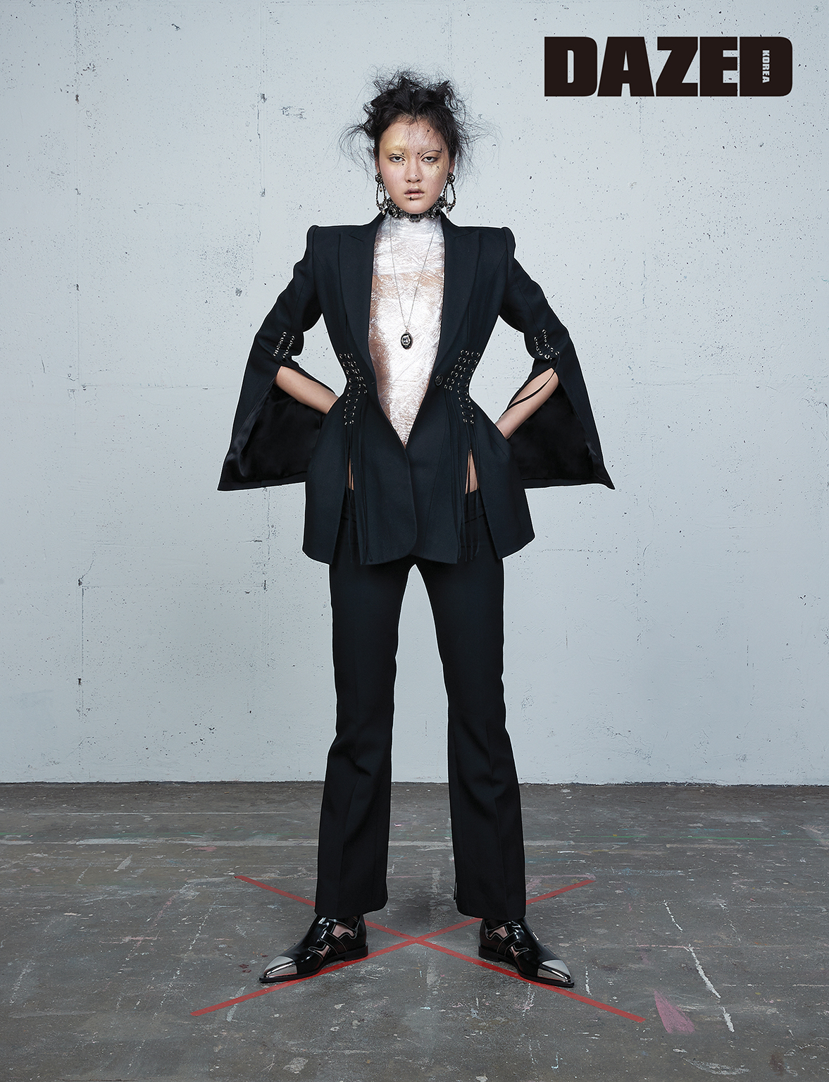 슬릿 디테일로 날렵함을 강조한 슈트 재킷과 팬츠, 부츠, 이어링, 초커, 네크리스는 모두 알렉산더 맥퀸(Alexander McQueen).