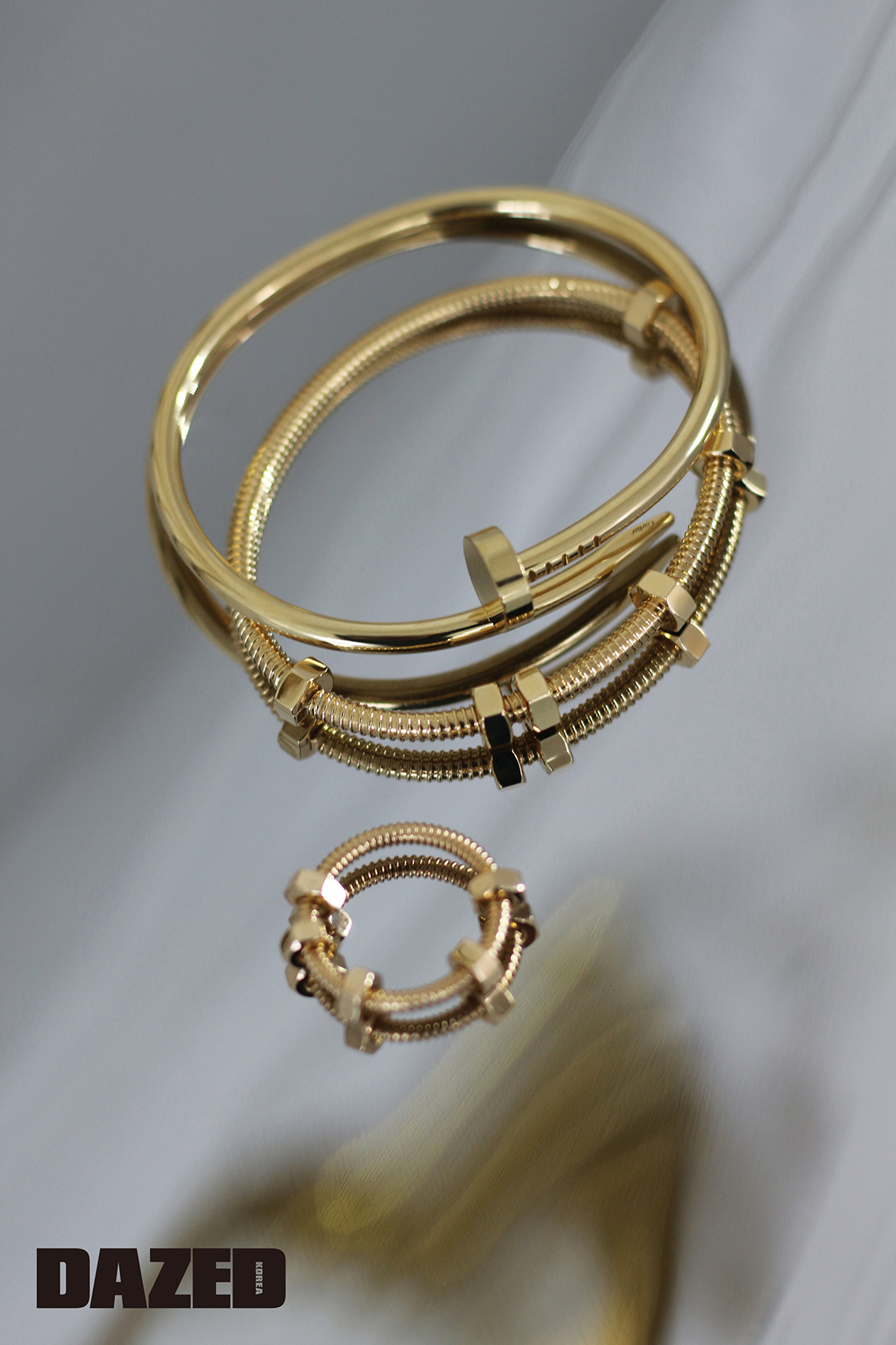 굴곡 있는 못 형태의 저스트 앵 끌루 브레이슬릿과 에크루 브레이슬릿, 링은 모두 까르띠에(Cartier).