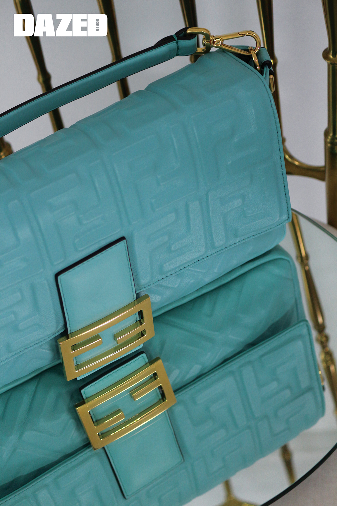금색 로고를 장식한 파스텔 블루 바게트 백은 펜디(Fendi).