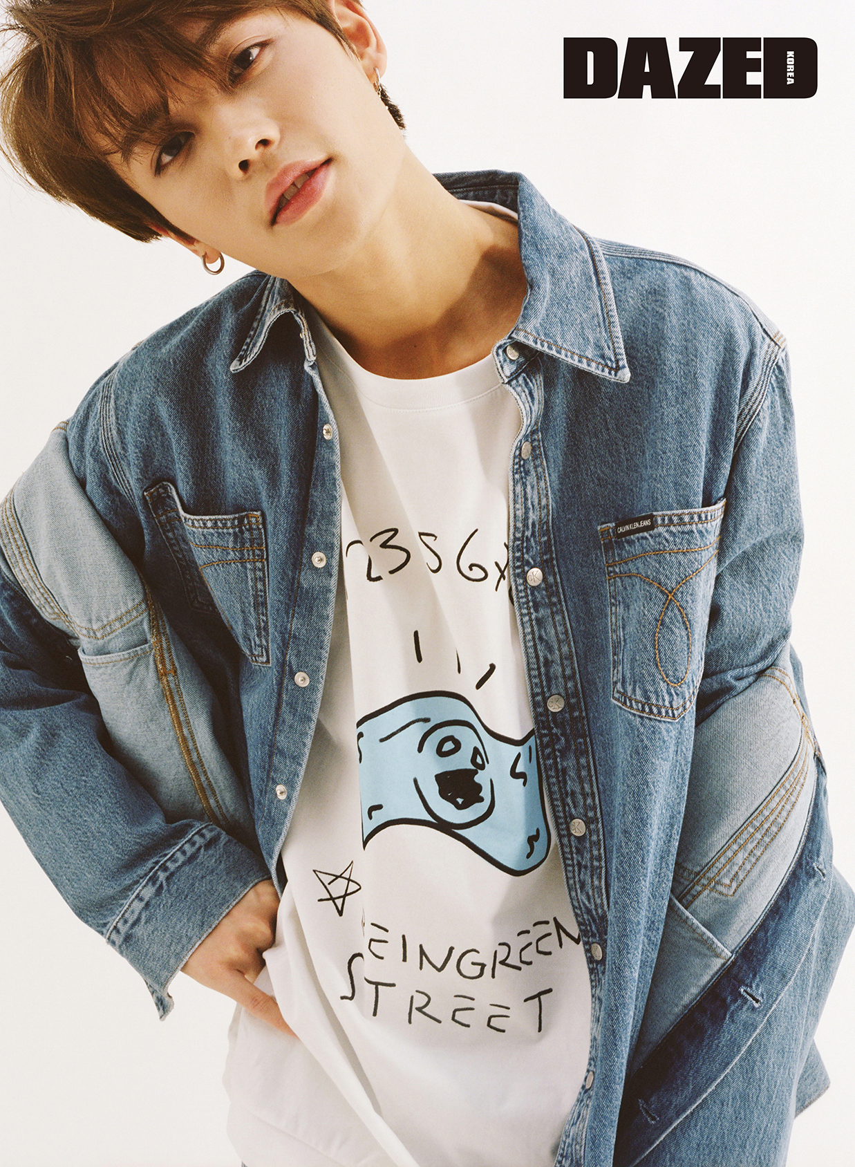 프린트 톱은 피스버드맨(Peacebird Men), 데님 재킷과 셔츠는 캘빈 클라인 진(Calvin Klein Jeans).