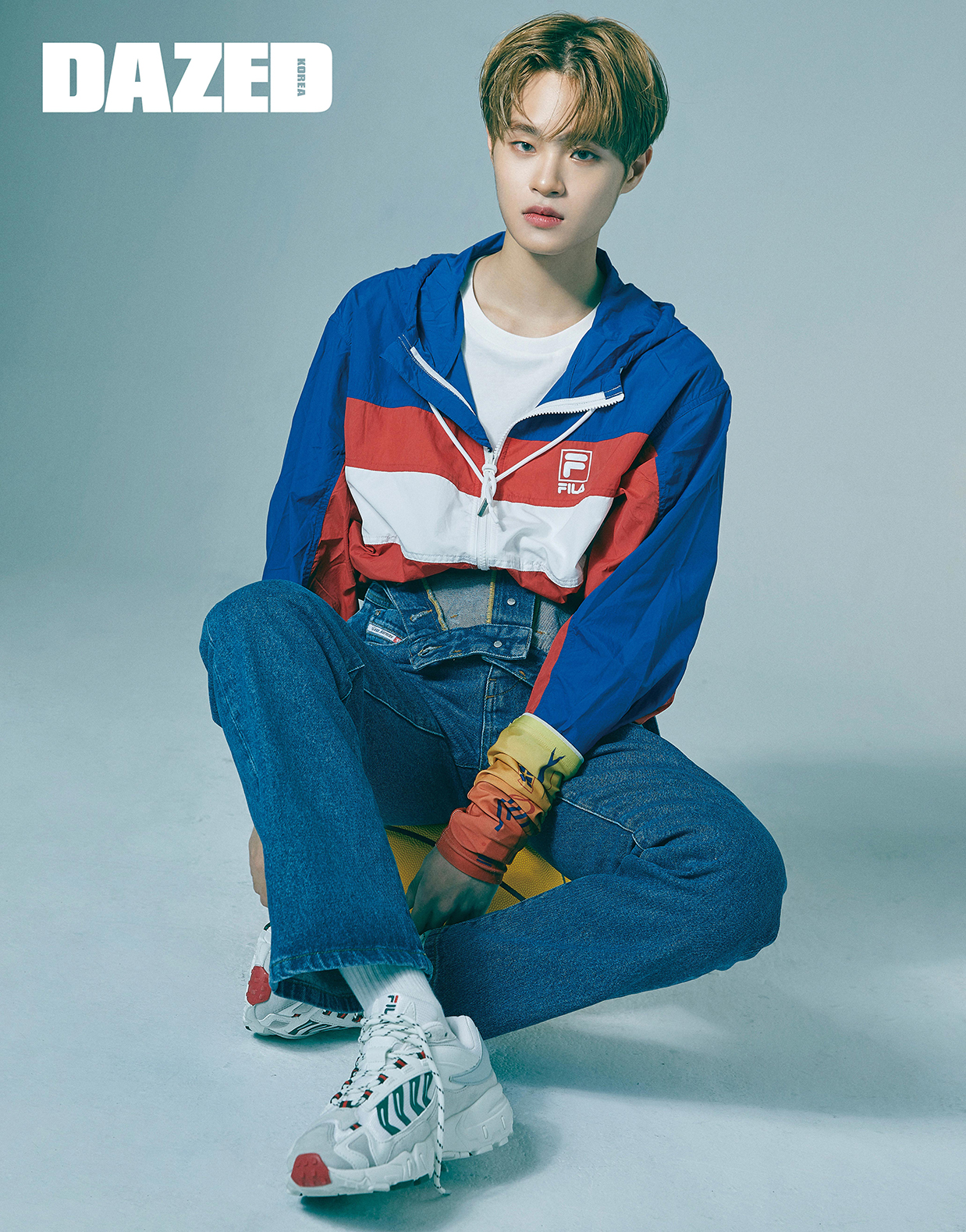 배색 블록 윈드브레이커와 이너로 입은 화이트 티셔츠, 운동화는 모두 휠라(FILA), 독특한 디테일의 하이웨이스트 진은 디젤 by 한스타일닷컴(Diesel by iHanstyle.com), 암 아머는 젠더 주(Xander Zhou)로 인턴 에디터의 것.