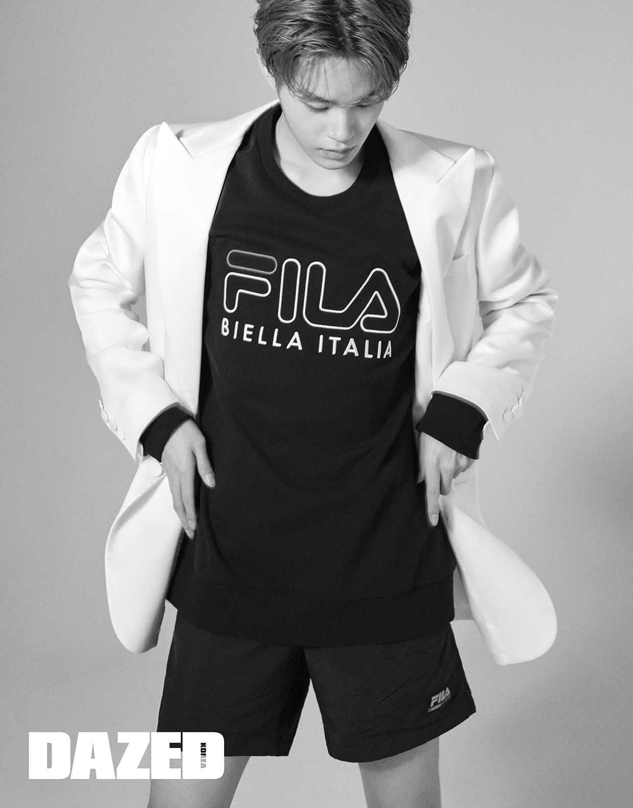 로고 스웨트셔츠와 쇼트 팬츠는 휠라(FILA), 칼라가 날렵한 화이트 슈트 재킷은 김서룡(Kimseoryong).