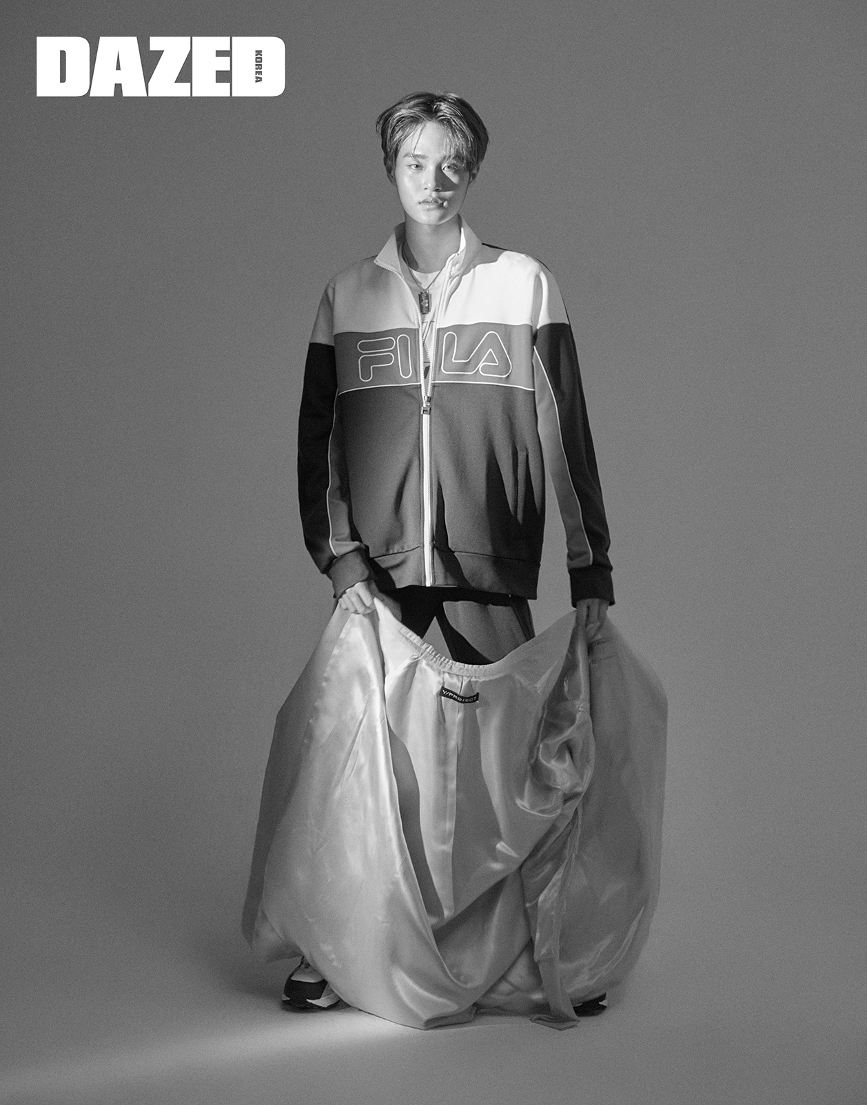 휠라 로고 트랙 슈트 재킷과 팬츠, 로고 티셔츠, 운동화는 모두 휠라(FILA), 양손으로 들고 있는 재킷은 와이프로젝트 by 한스타일닷컴(Y/Project by iHanstyle.com), 실버 네크리스는 인턴 에디터의 것.