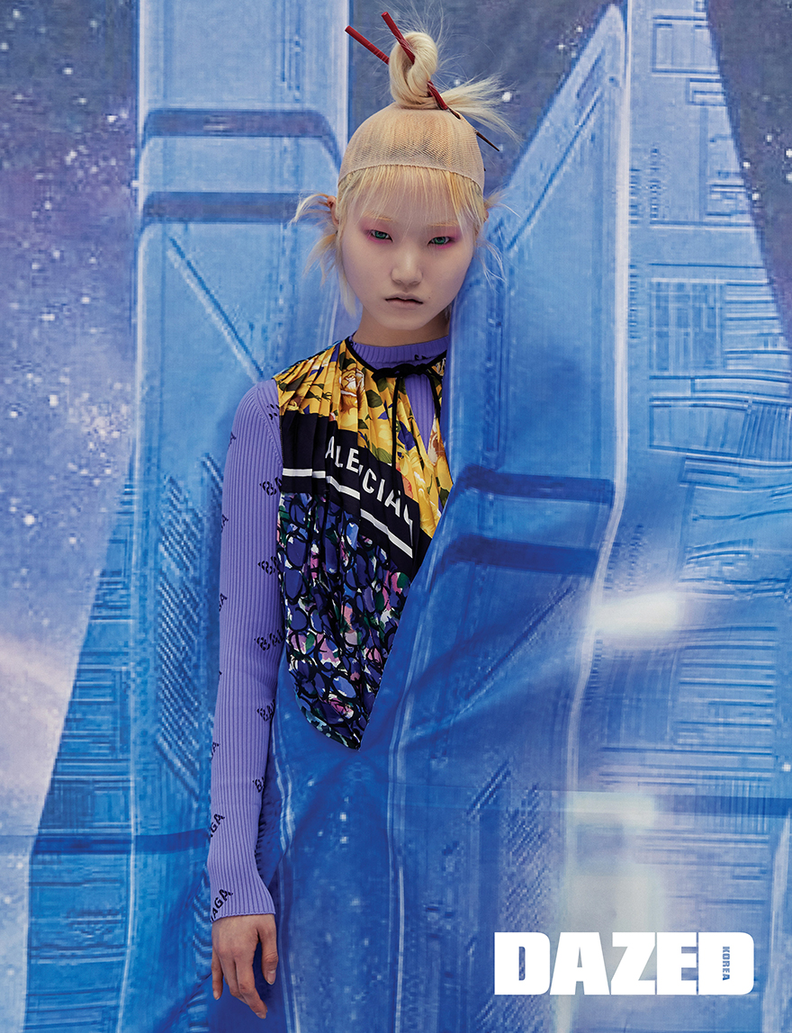 패턴과 레터링을 믹스한 슬리브리스 드레스와 니트 톱은 발렌시아가(Balenciaga).