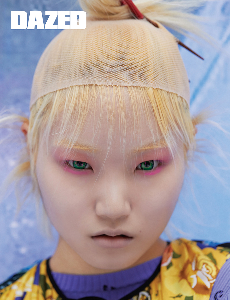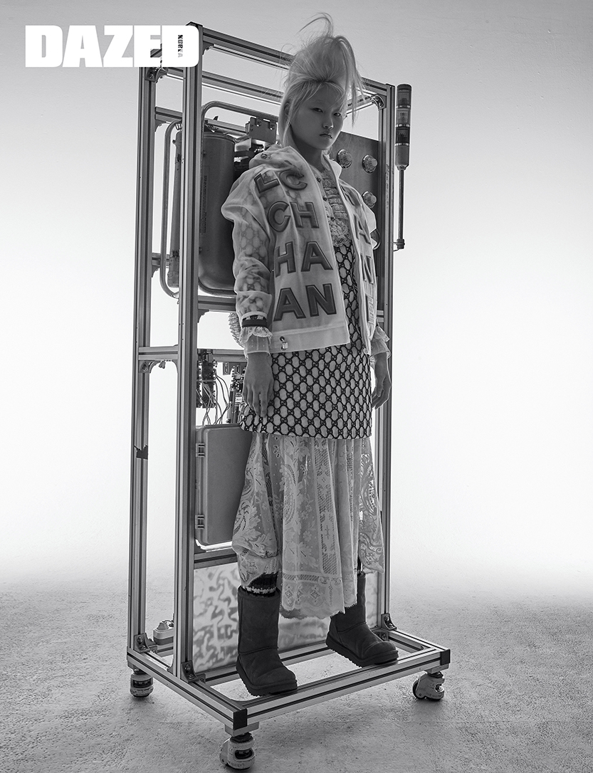 시스루 집업 재킷은 샤넬(Chanel), 모노그램 러플 장식 원피스는 구찌(Gucci), 이너로 입은 화이트 드레스는 디올(Dior), 양말을 레이어드한 양털 부츠는 사카이 X 어그(Sacai X Ugg).