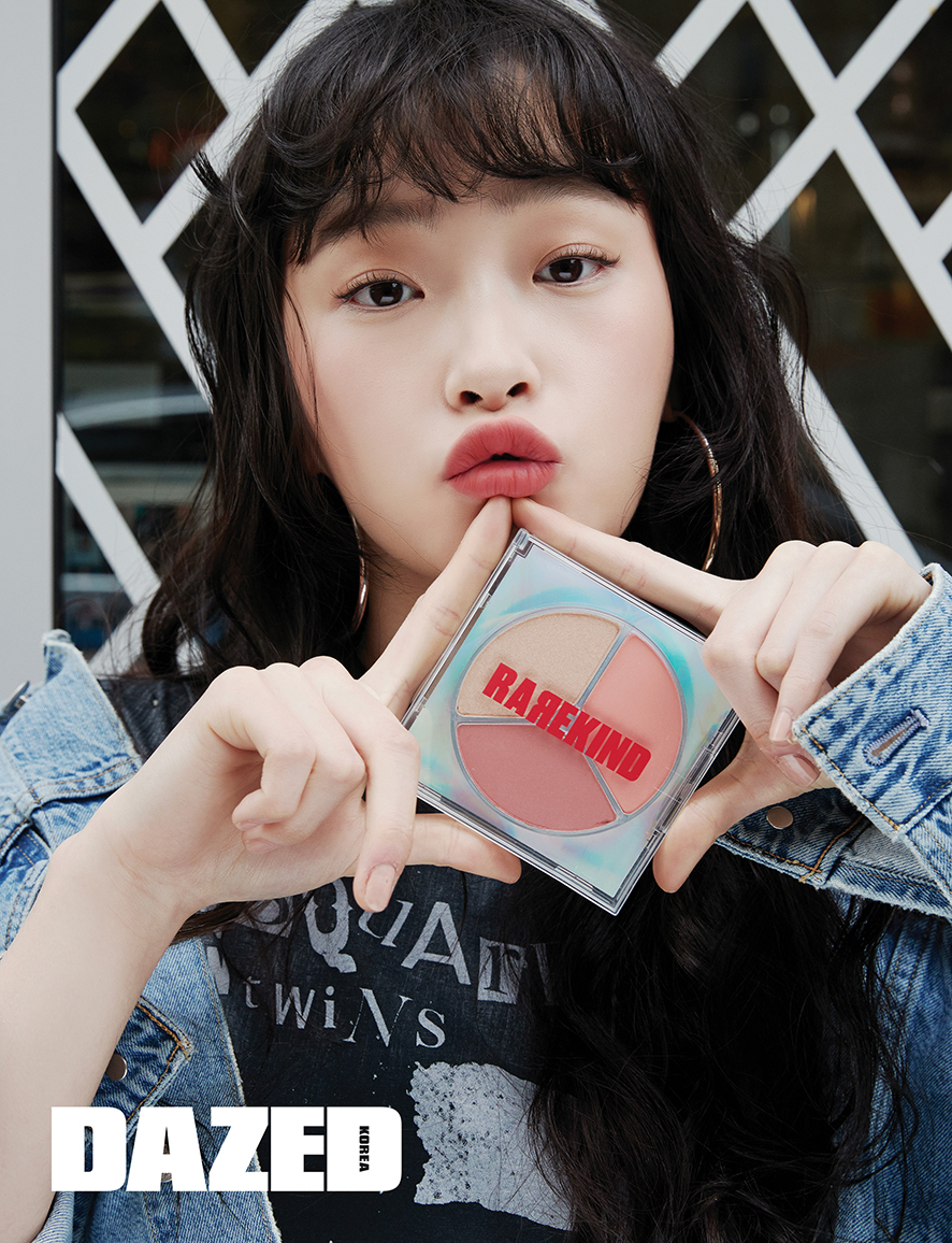 레어카인드 미니앨범 1집 01 믹스앤하이 코랄(Mix And High Coral Ver.) 중 짙은 컬러의 블러셔를 관자놀이부터 콧잔등까지 연결해 펴 바른다. 골드 하이라이터로 광대뼈 윗부분과 눈두덩 중앙 부분에 포인트를 준다. 레어카인드 오버스머지 립 틴트 크림슨 룰즈(Crimson Rules)를 입술 중앙에 소량만 바른 뒤 손으로 문질러 번진 듯이 연출한다.