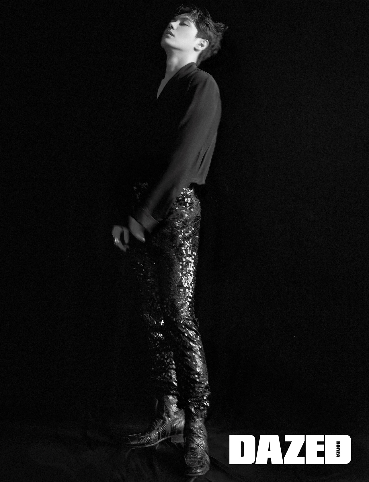 셔츠와 스팽글 팬츠는 김서룡(Kimseoryong), 파이톤 부츠는 생 로랑 by 안토니 바카렐로(Saint Laurent by Anthony Vaccarello).