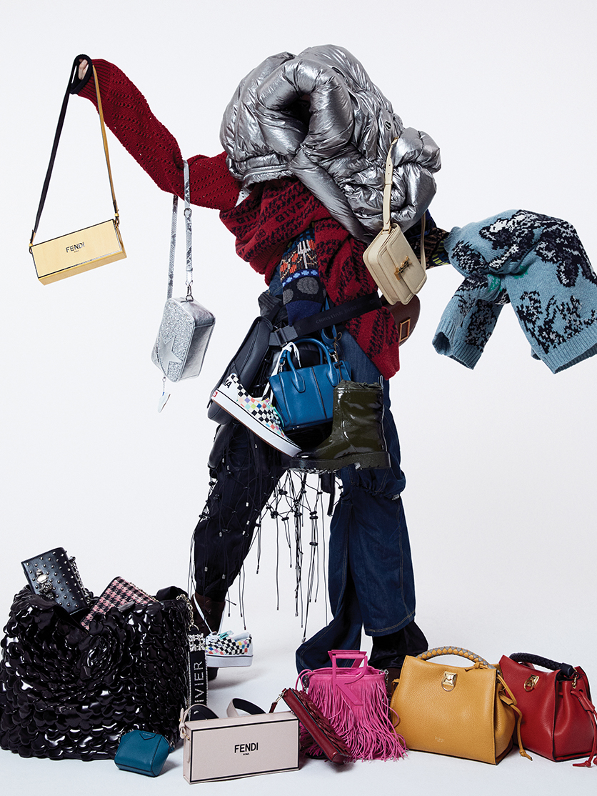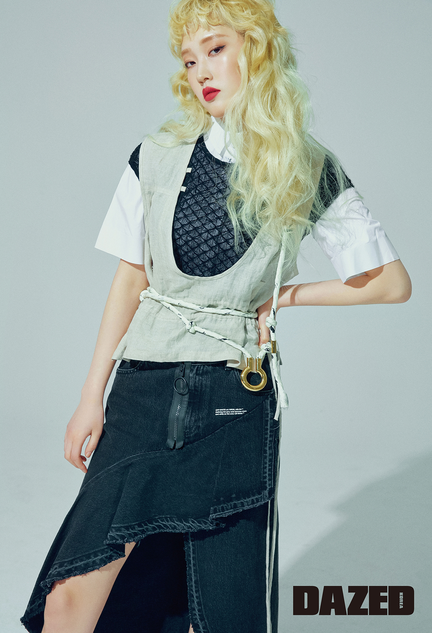 블랙 니트 톱은 미쏘니(Missoni), 레이어드한 베스트는 윈도우00(Window00), 보디에 연출한 로프 벨트는 씨바이끌로에(See by Chloe), 셔츠는 알렉산더 왕(Alexander Wang)으로 에디터의 것, 스커트는 오프화이트(Off-White)로 에디터의 것.