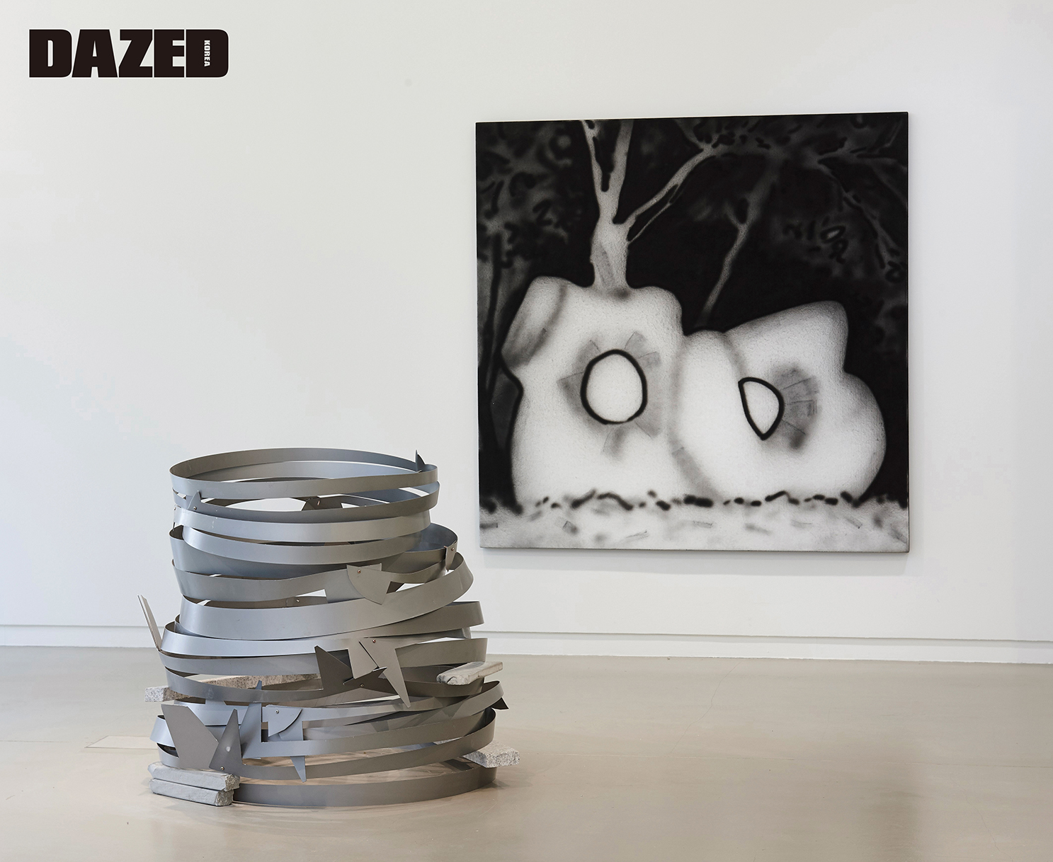 (왼쪽)정지현, 무한 메탈, 2019, 알루미늄, 돌, 시멘트, 70x70x70cm (오른쪽)정지현, 나무와 동상, 2019, 방음재, hard-gloss paint, 120x122x3cm