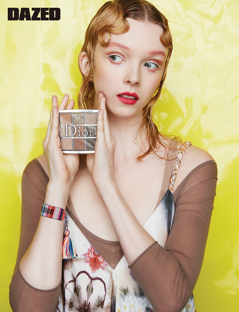 디올 백스테이지 페이스&바디 프라이머 001 유니버설(6월 국내 출시 예정)과 디올 백스테이지 페이스&바디 파운데이션 OW로 매끈하고 보송보송한 베이스 메이크업을 완성한다. 디올 백스테이지 아이 팔레트 001 웜 뉴트럴의 쉬머 코퍼매트 오크레를 섞어 눈두덩에 바른다. 눈썹과 언더는 디올 어딕트 립 팔레트 001 유니버설 뉴트럴의 새틴 로즈우드를 발라 형태를 잡고, 그 위에 디올 루즈 블러쉬 475 로즈 카프리스를 덧바른다. 디올 루즈 블러쉬 136 델리케이트 매트를 양 볼에 발라 살굿빛 치크를 연출한다. 디올쇼 콜 009 화이트 콜로 아이 홀과 눈머리, 애교 살 밑에 라인을 그려 넣어 포인트를 준다. 코럴 핑크빛의 디올 어딕트 스텔라 샤인 673 디올참을 입술 전체에 가득 메워 발라 마무리한다.