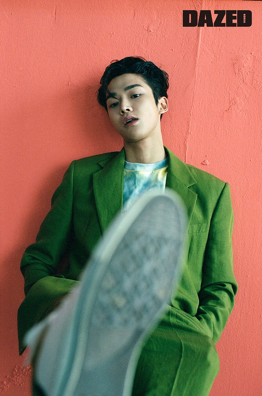 그린 컬러 슈트 재킷과 팬츠는 김서룡 옴므(Kimseoryong Homme), 이너로 입은 타이다이 톱은 모어댄도프(More Than Dope).