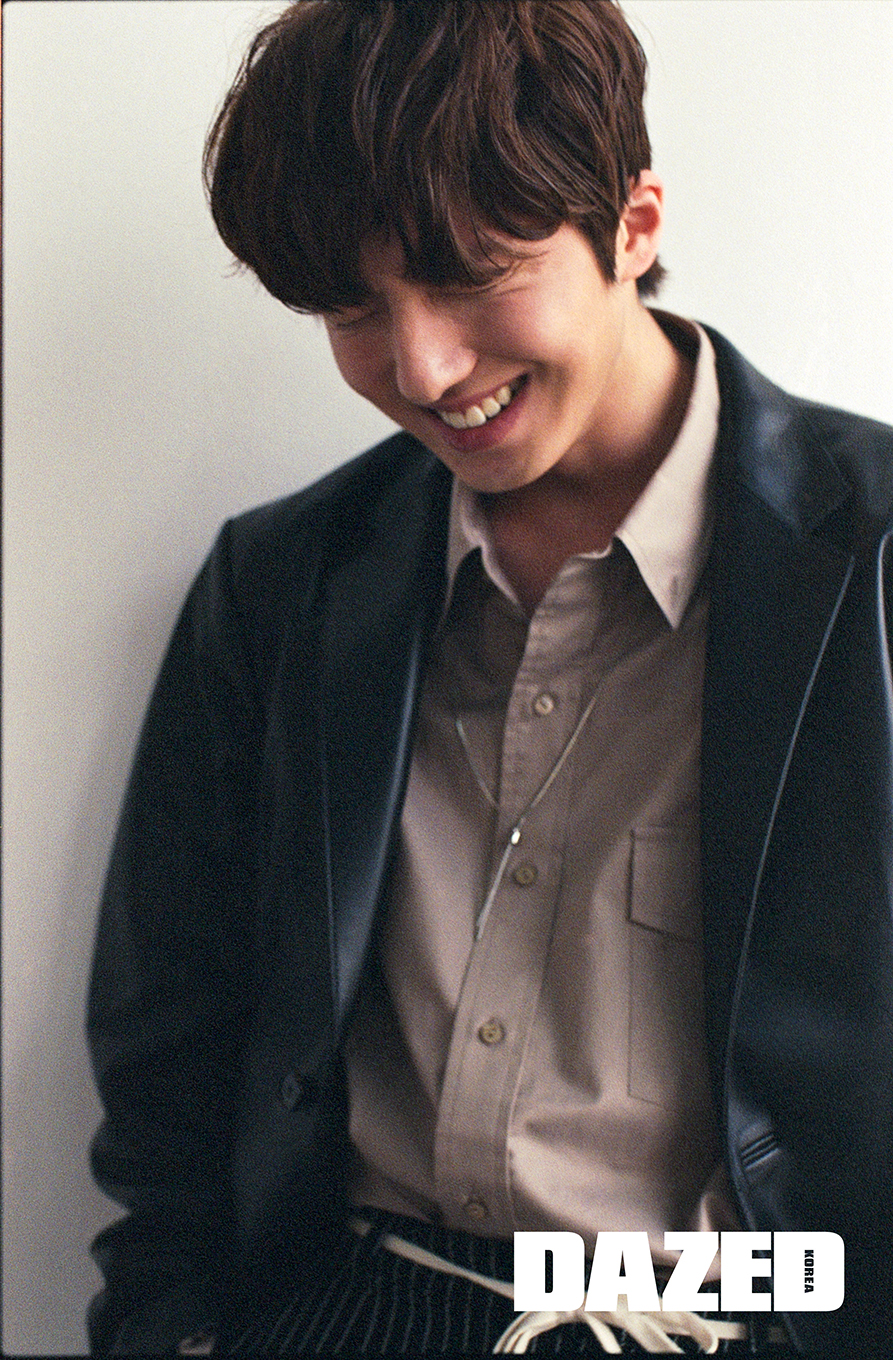 레더 재킷은 토니웩 by 이티씨서울(Tonywack by ETC Seoul), 브라운 셔츠는 데일리 미러(Daily Mirror), 스트라이프 팬츠는 레프리제트 by 톰 그레이하운드(Represent by Tom Greyhound), 드롭 펜던트 네크리스는 밀튼 아티카(Milton Attica).