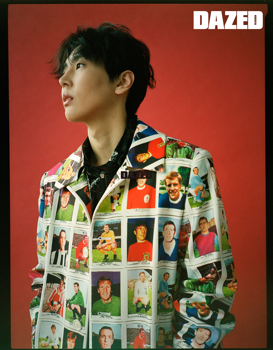 축구 선수 포트레이트 사진을 프린트한 패턴 코트와 이너로 입은 재킷은 챈스챈스(ChanceChance), 레드 블랙 팬츠는 이티스 by 웍스아웃(Eytys by Workout),