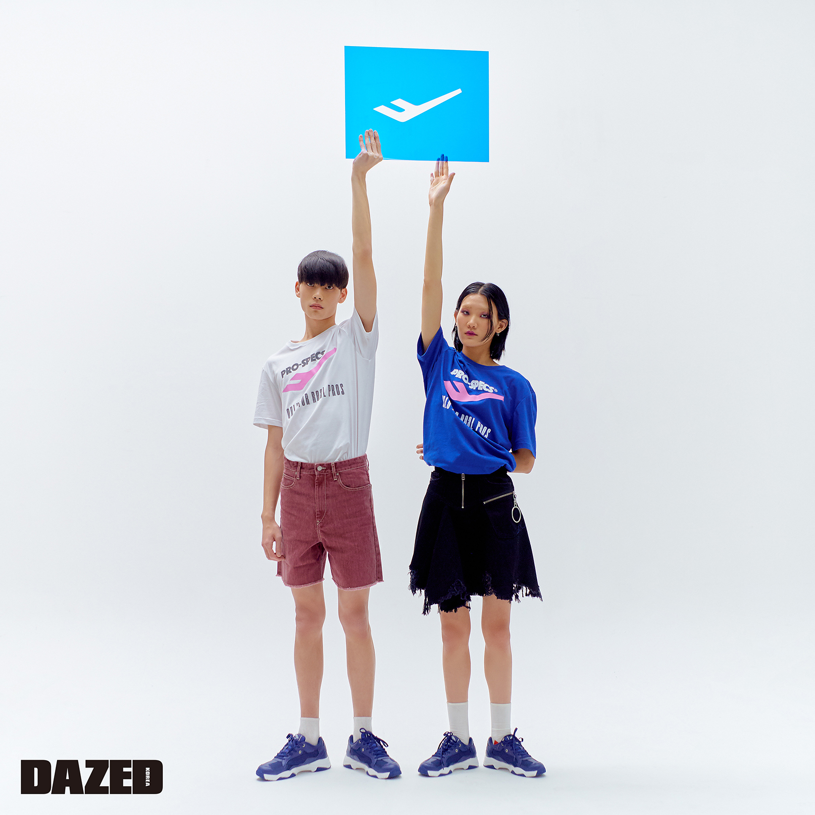 주영이 입은 핑크 로고 티셔츠와 운동화 뉴트로라인 네이비 103은 프로스펙스, 팬츠는 이자벨 마랑(Isabel Marant). 지예가 입은 블루 티셔츠와 운동화 뉴트로라인 네이비 103은 프로스펙스, 디스트로이드 데님 스커트는 디젤(Diesel).