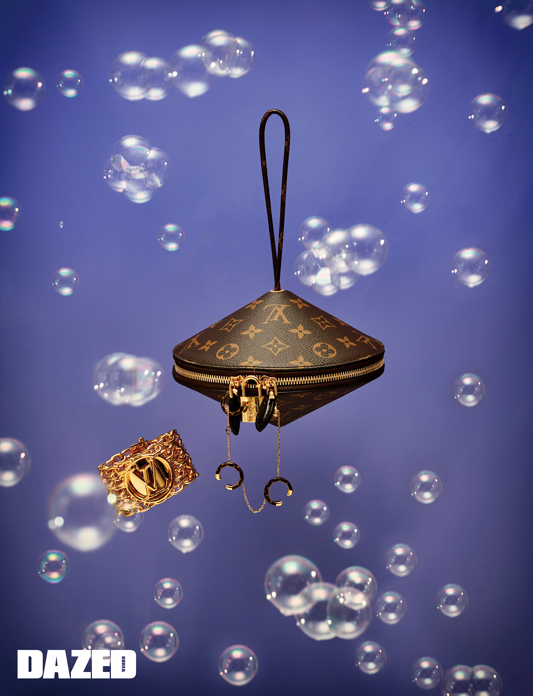 화려한 로고 체인 브레이슬릿과 독특한 UFO 실루엣의 백, 백 손잡이에 걸어놓은 후프 이어링은 모두 루이 비통(Louis Vuitton).