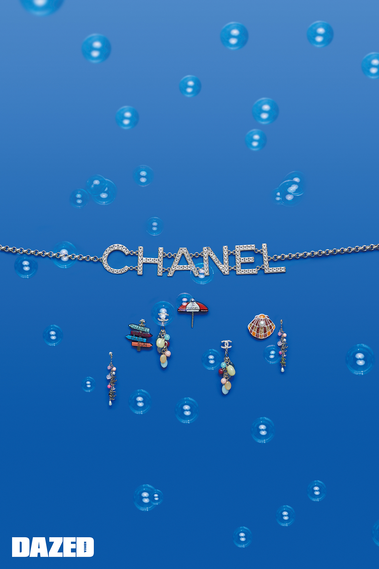 로고에 주얼 장식을 더한 비즈 드롭 이어링, 현수막 모티브 펜던트, 진주를 머금은 조개를 표현한 펜던트는 모두 샤넬(Chanel).
