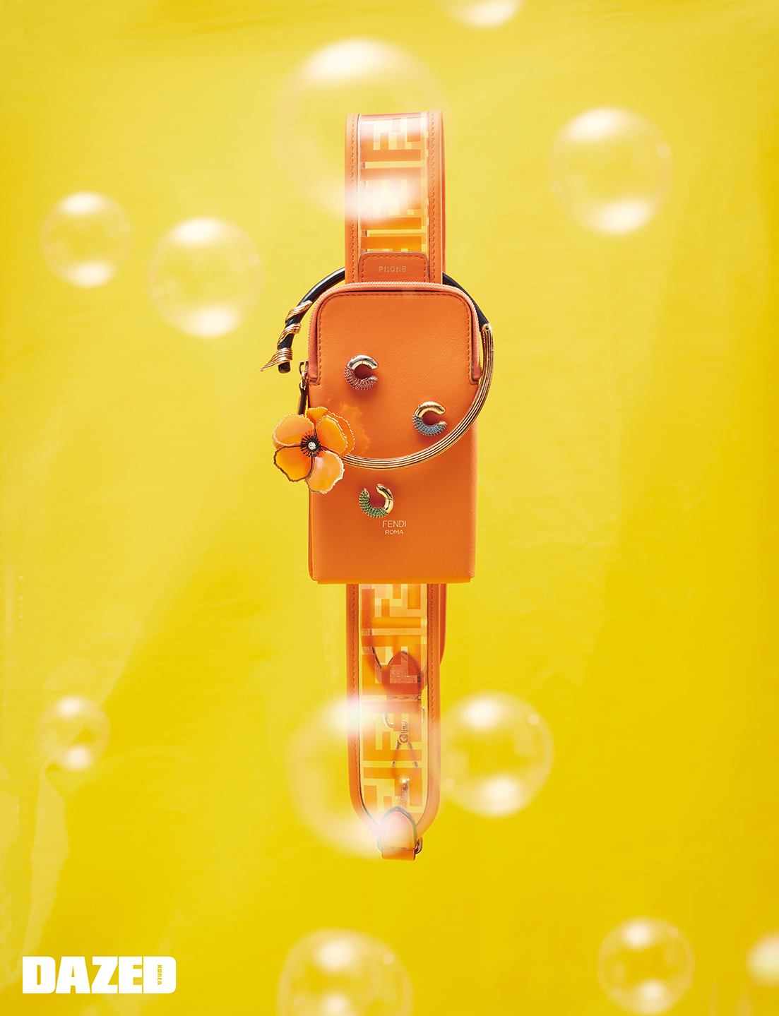 오렌지 컬러 로고의 PVC 숄더 스트랩 포켓 백과 꽃잎 디테일의 초커, 크리스털 이어 커프는 모두 펜디(Fendi).