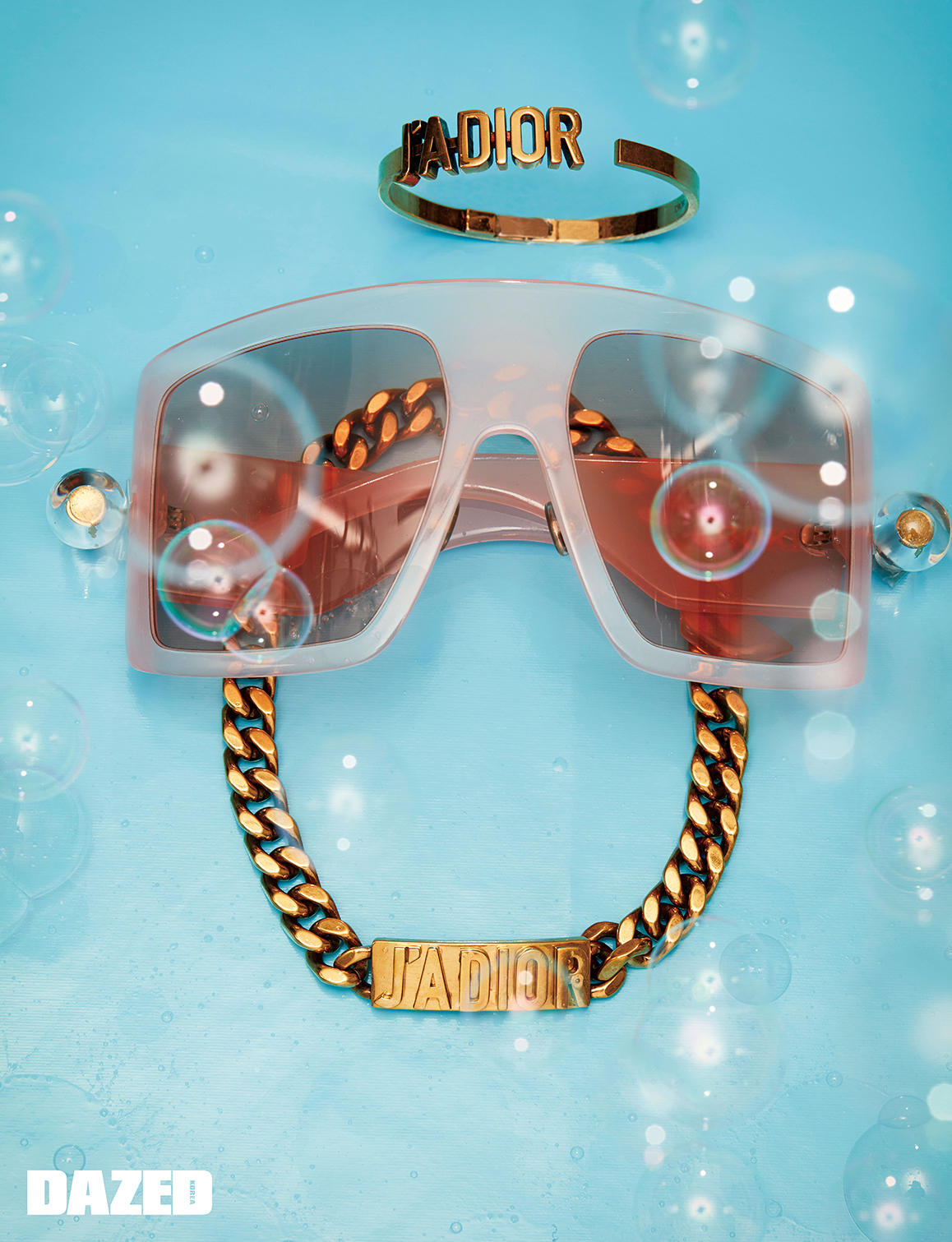 로고 브레이슬릿과 오버 실루엣의 핑크 선글라스, 투명한 비즈 이어링, 로고 체인 초커는 모두 디올(Dior).
