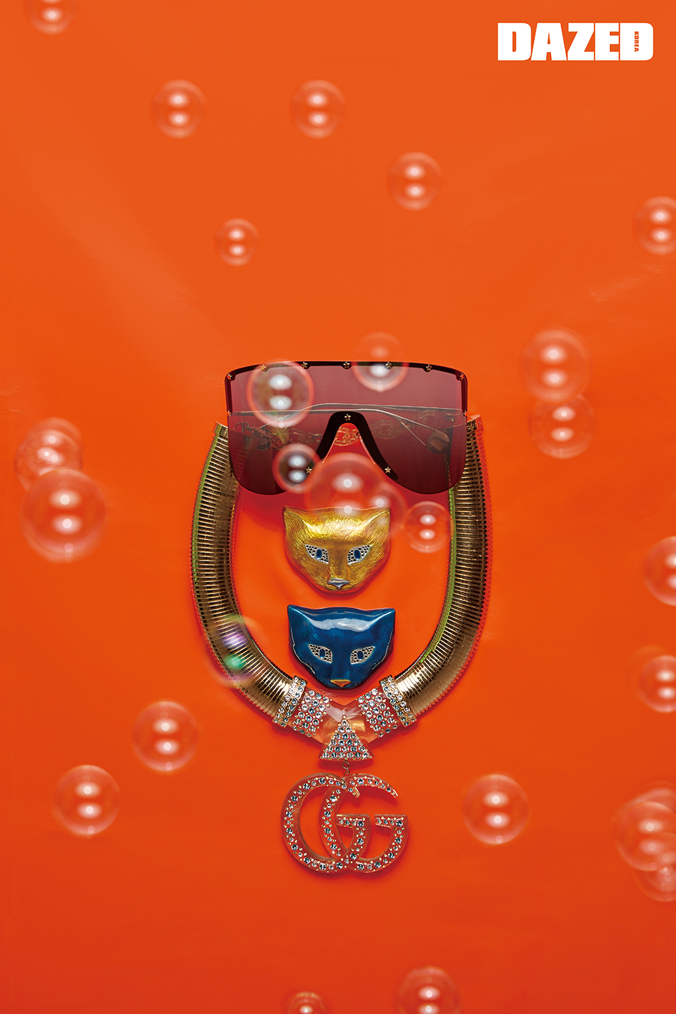 아우트라인에 별 스터드를 장식한 고글과 볼드한 GG 펜던트 네크리스, 고양이 가면 모티브 옐로와 블루 브로치는 모두 구찌(Gucci).