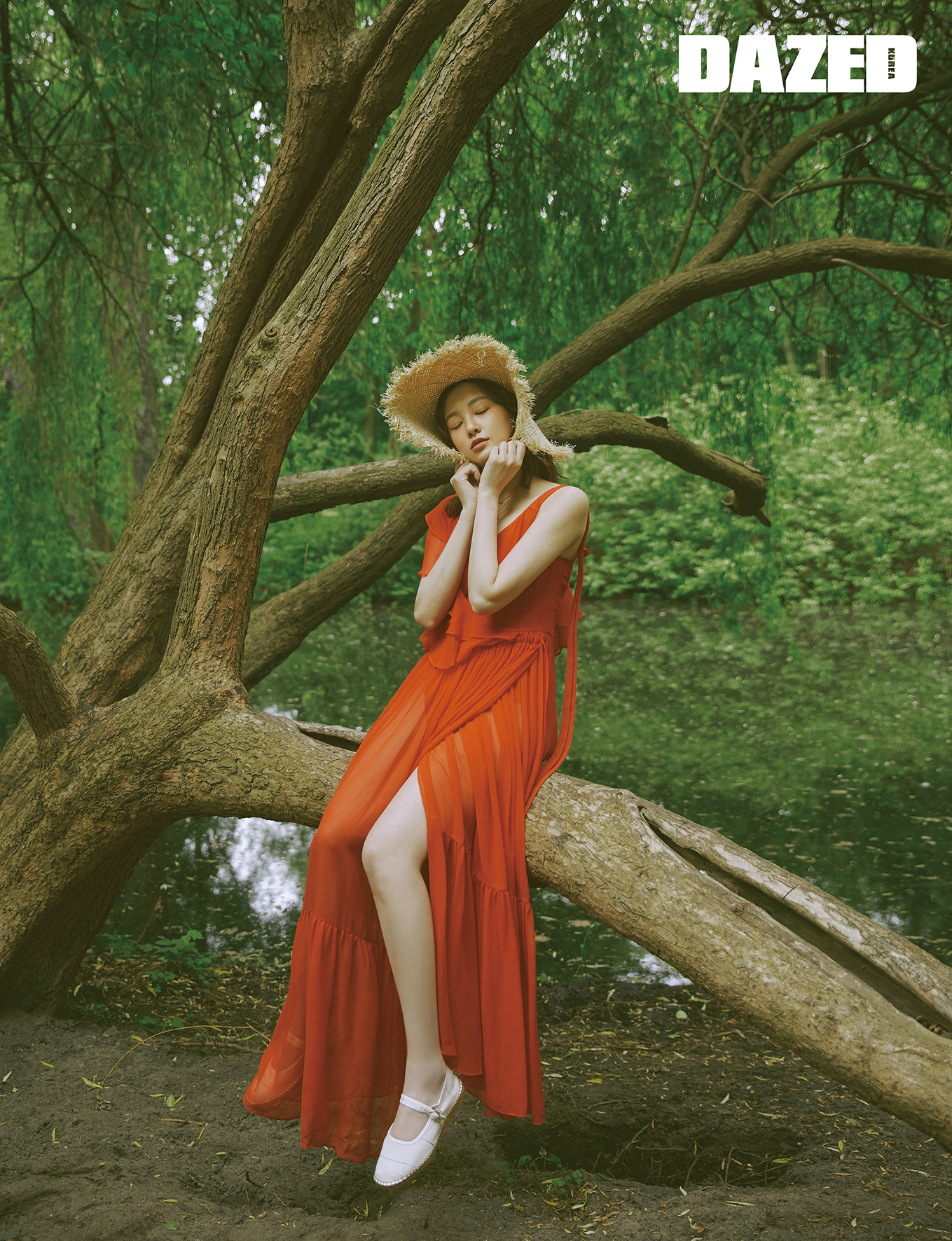 시폰 소재의 레드 롱 드레스는 뮤제(Musee), 레이어드한 레드 스윔슈트와 라피아 해트는 H&M, 메리제인 에스파드리유 슈즈는 나귀사(Naguisa), 레이어드한 골드 네크리스는 오에스티(OST).