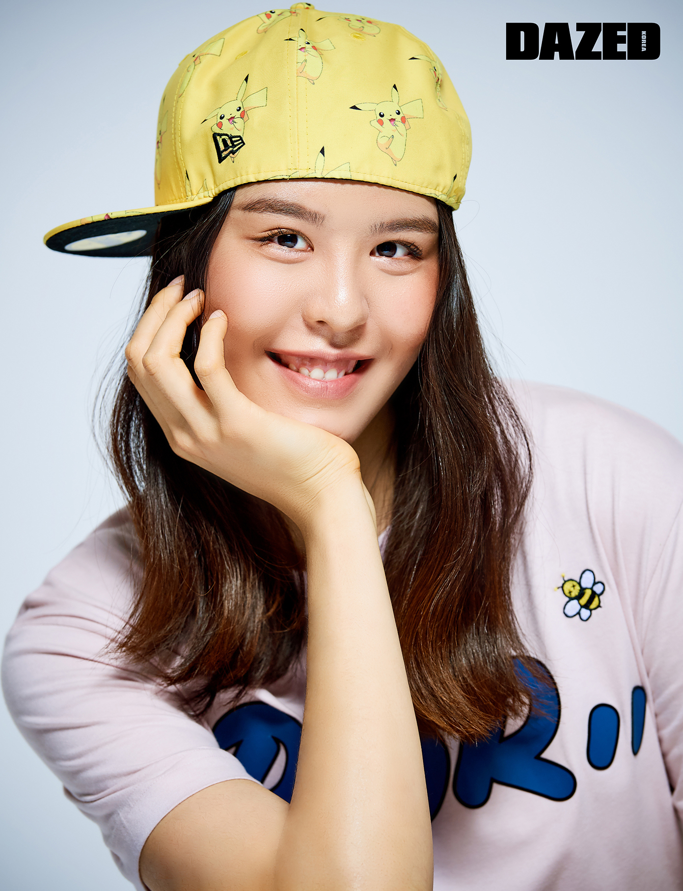 페일 핑크 컬러의 로고 티셔츠는 디올(Dior), 피카츄 캐릭터를 프린트한 옐로 캡은 에디터 소장품.
