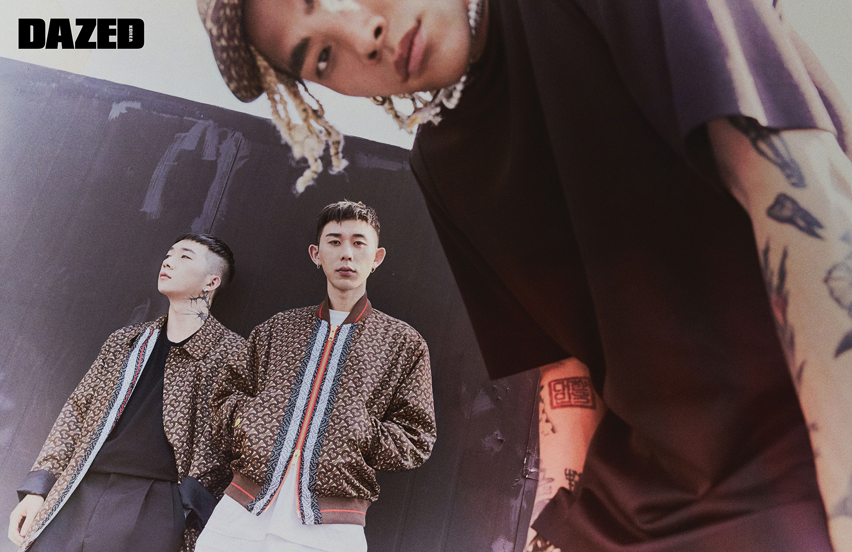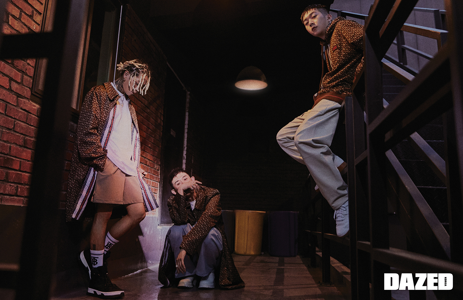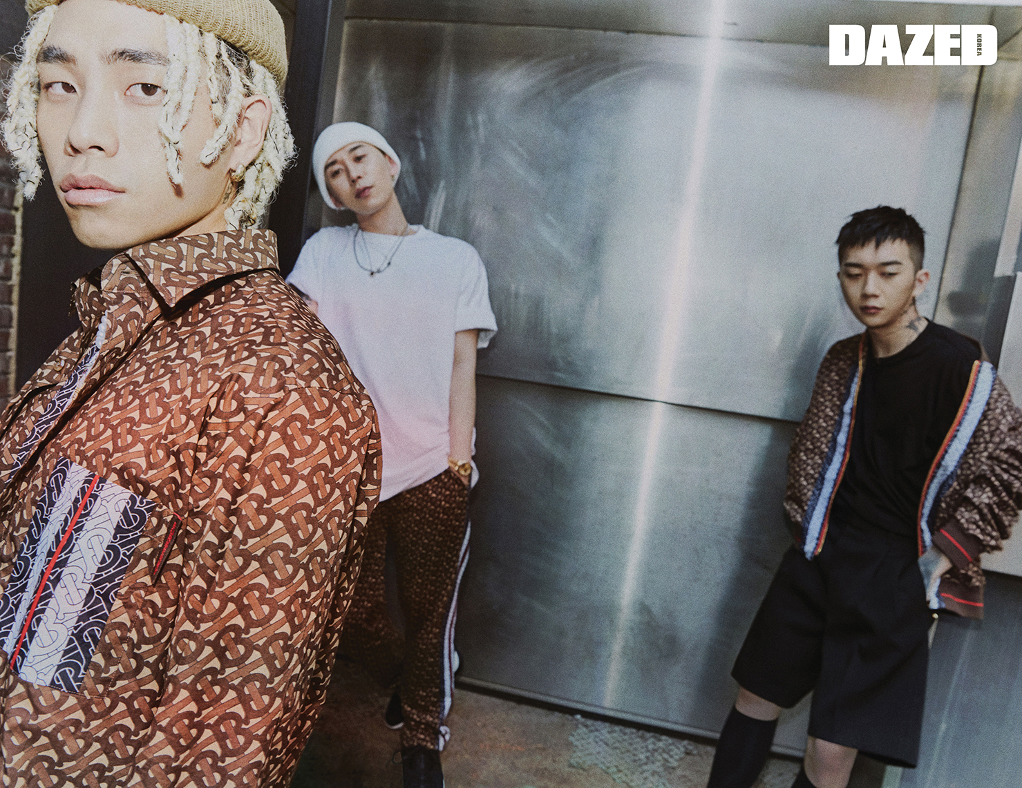 우원재가 입은 토마스 버버리 모노그램 컬렉션의 카 코트는 버버리(Burberry), 리워크드 블랙 티셔츠는 요지 야마모토(Yohji Yamamoto), 핀턱 쇼츠는 8 by 육스(8 by YOOX). 코드 쿤스트가 입은 토마스 버버리 모노그램 컬렉션의 컬러 스트라이프 포인트 보머 재킷과 화이트 톱은 버버리(Burberry). 레디가 착용한 토마스 버버리 모노그램 컬렉션의 볼 캡은 버버리(Burberry), 티셔츠는 COS, 네크리스는 레디의 것.