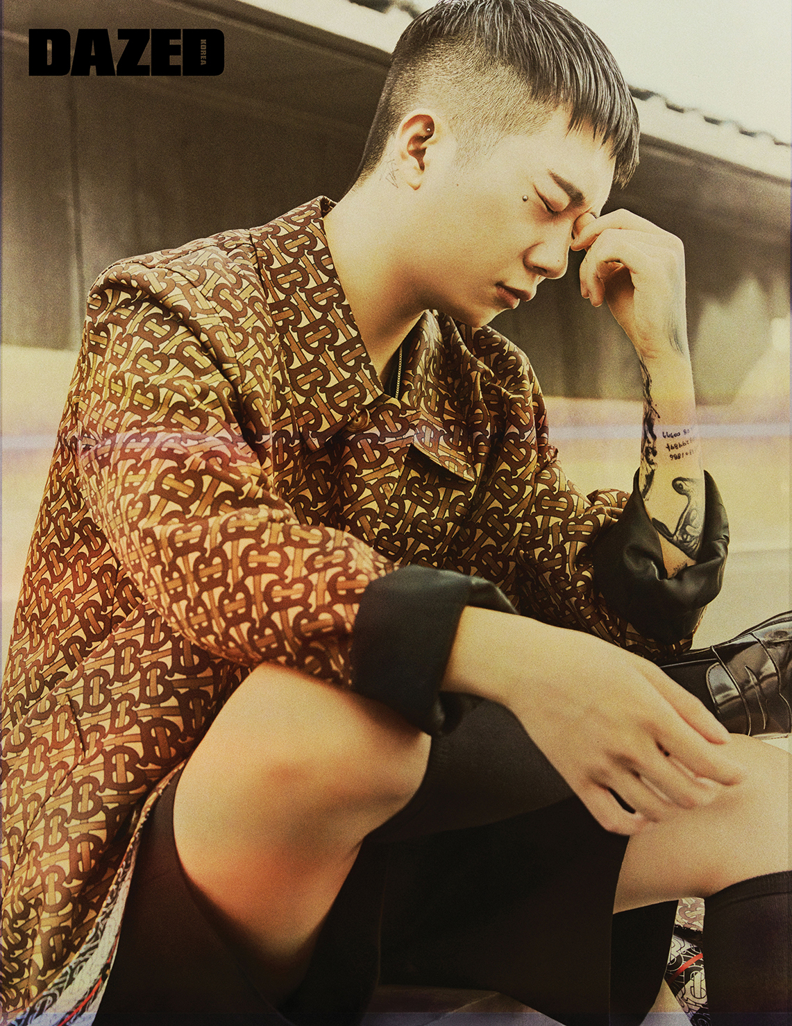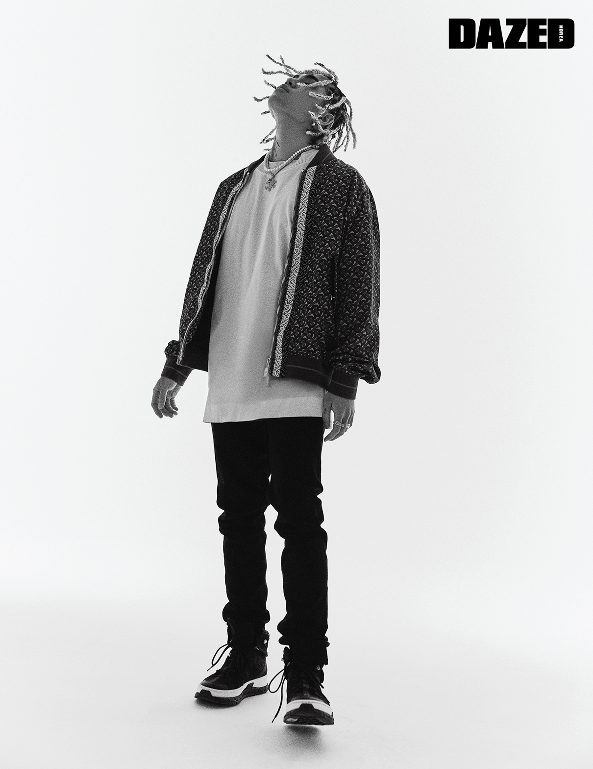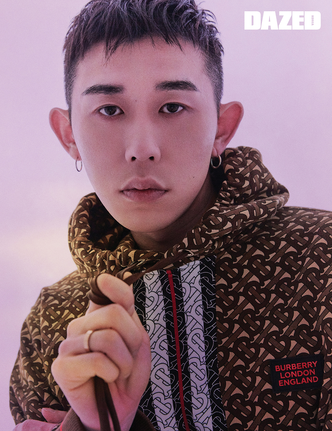 우원재가 입은 토마스 버버리 모노그램 컬렉션의 카 코트는 버버리(Burberry), 리워크드 블랙 티셔츠는 요지 야마모토(Yohji Yamamoto), 핀턱 쇼츠는 8 by 육스(8 by YOOX). 코드 쿤스트가 입은 토마스 버버리 모노그램 컬렉션의 컬러 스트라이프 포인트 보머 재킷과 화이트 톱은 버버리(Burberry). 레디가 착용한 토마스 버버리 모노그램 컬렉션의 볼 캡은 버버리(Burberry), 티셔츠는 COS, 네크리스는 레디의 것.