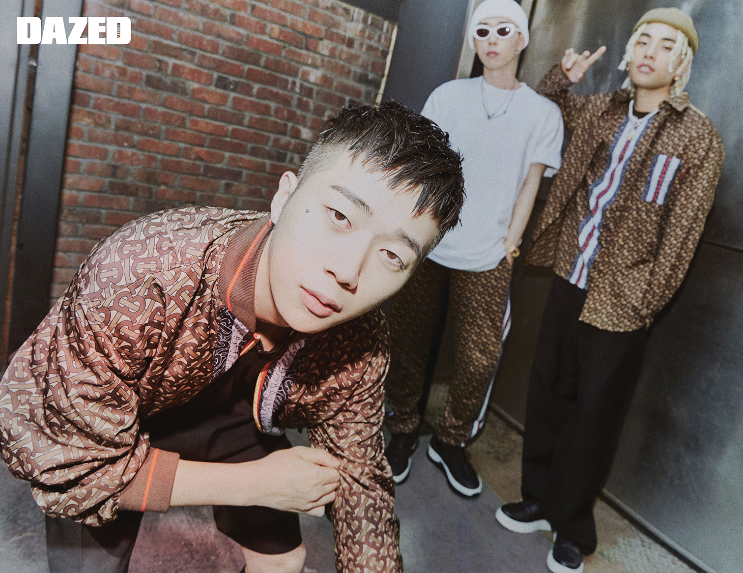 우원재가 입은 토마스 버버리 모노그램 컬렉션의 컬러 라이닝 디테일 보머 재킷은 버버리(Burberry), 블랙 티셔츠는 요지 야마모토(Yohji Yamamoto), 핀턱 쇼츠는 8 by 육스(8 by YOOX), 니 삭스는 에디터의 것. 코드 쿤스트가 입은 티셔츠와 토마스 버버리 모노그램 컬렉션의 스트라이프 포인트 트랙 팬츠, 하이톱 스니커즈는 모두 버버리(Burberry), 화이트 프레임 선글라스는 버버리 by 룩소티카(Burberry by Luxottica), 비니와 주얼리는 모두 코드 쿤스트의 것. 레디가 입은 토마스 버버리 모노그램 컬렉션의 스트라이프 포켓 디테일 셔츠와 토마스 버버리 모노그램 컬렉션의 티셔츠는 버버리(Burberry), 블랙 트라우저는 발렌티노(Valentino), 슬립온은 닥터마틴(Dr. Martens), 비니는 레디의 것.