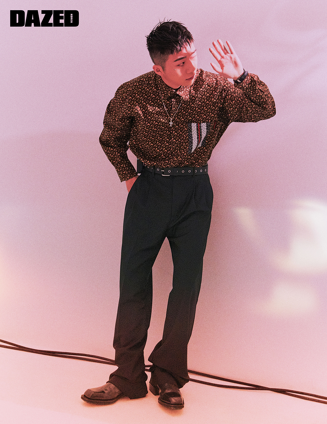토마스 버버리 모노그램 컬렉션의 스트라이프 포켓 디테일 셔츠는 버버리(Burberry), 블랙 트라우저는 발렌티노(Valentino), 부츠는 알렉산더 맥퀸(Alexander McQueen), 십자가 펜던트 네크리스는 포체이서(Forchaser), 벨트는 우원재의 것.