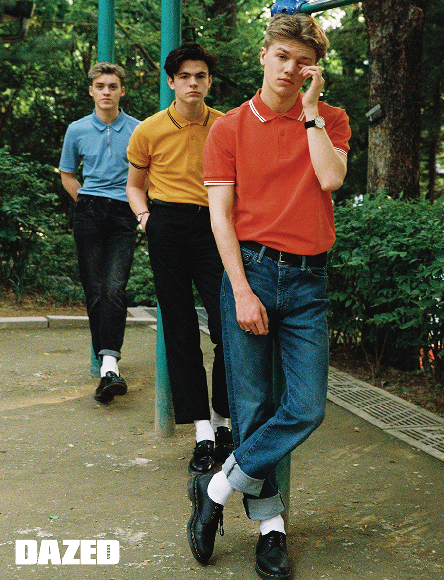 리스가 입은 블루 피케 셔츠는 프레드 페리(Fred Perry), 데님 팬츠는 리바이스(Levi’s), 로퍼는 리스의 것. 블레이크가 입은 노란색 피케 셔츠는 프레드 페리(Fred Perry), 블랙 팬츠와 로퍼는 블레이크의 것. 조지가 입은 레드 피케 셔츠는 프레드 페리(Fred Perry), 데님 팬츠는 리바이스(Levi’s), 로퍼는 조지의 것.