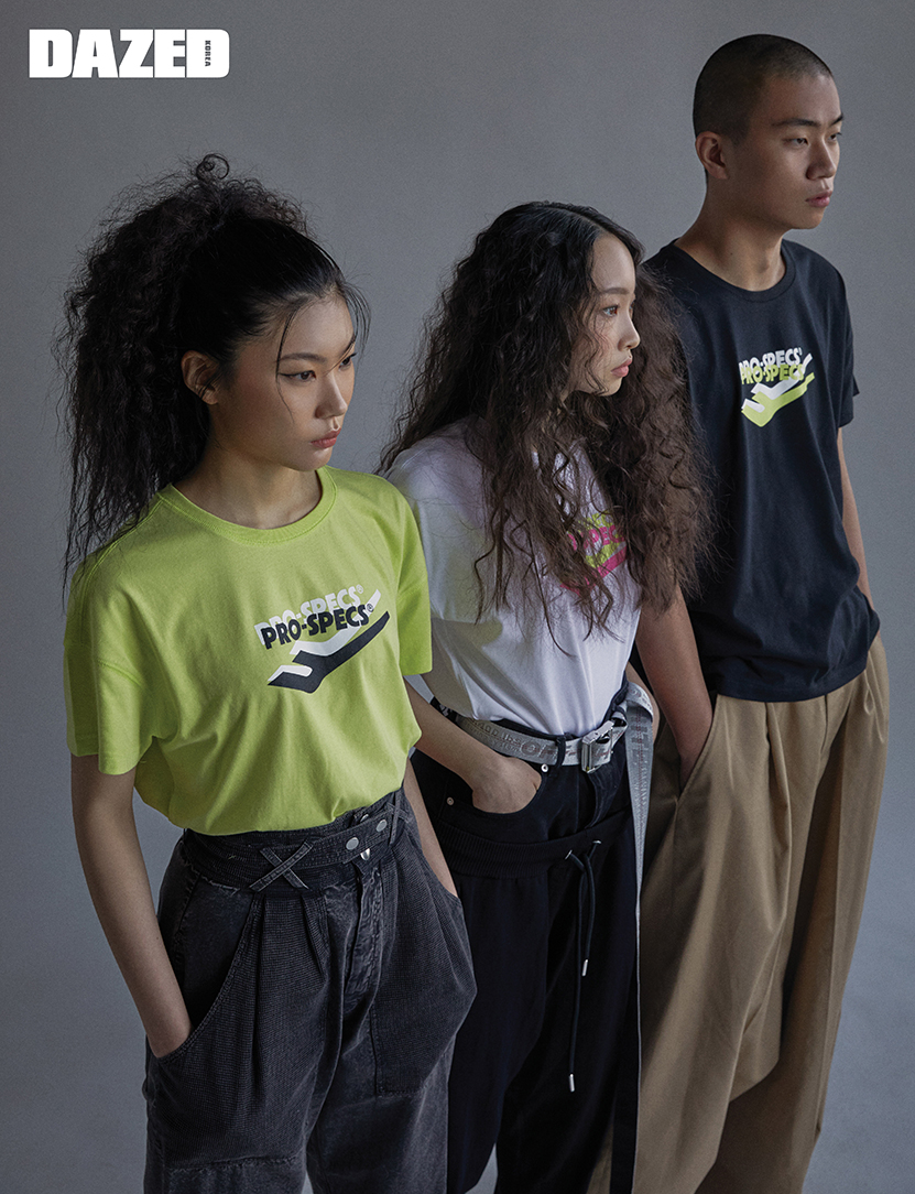 미림이 입은 네온 컬러 반팔 톱은 프로스펙스(Pro-specs), 그레이 워싱 팬츠는 이자벨 마랑(Isabel Marant). 린애가 입은 화이트 톱은 프로스펙스(Pro-specs), 블랙 데님과 레이어드한 트랙 팬츠는 디젤(Diesel), 실버 롱 벨트는 오프화이트(Off-White). 의진이 입은 블랙 로고 네온 컬러 톱은 프로스펙스(Pro-specs), 베이지 와이드 팬츠는 8 몽클레르 팜 엔젤스(8 Moncler Palm Angels).
