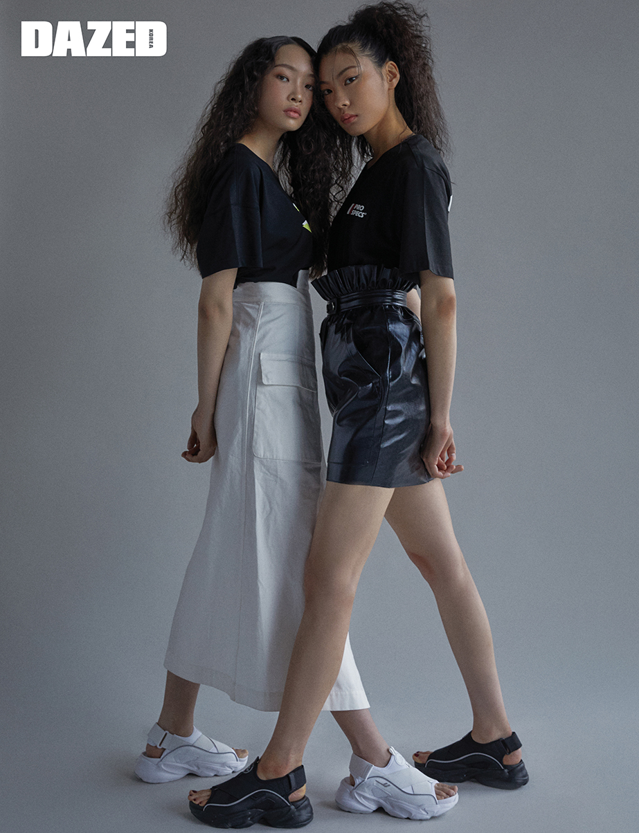 린애가 입은 네온 로고 블랙 톱과 화이트 샌들은 프로스펙스(Pro-specs), 화이트 스커트는 골든 구스(Golden Goose). 미림이 입은 블랙 반팔 톱과 블랙 샌들은 프로스펙스(Pro-specs), 레더 스커트는 로맨시크(Romanchic).
