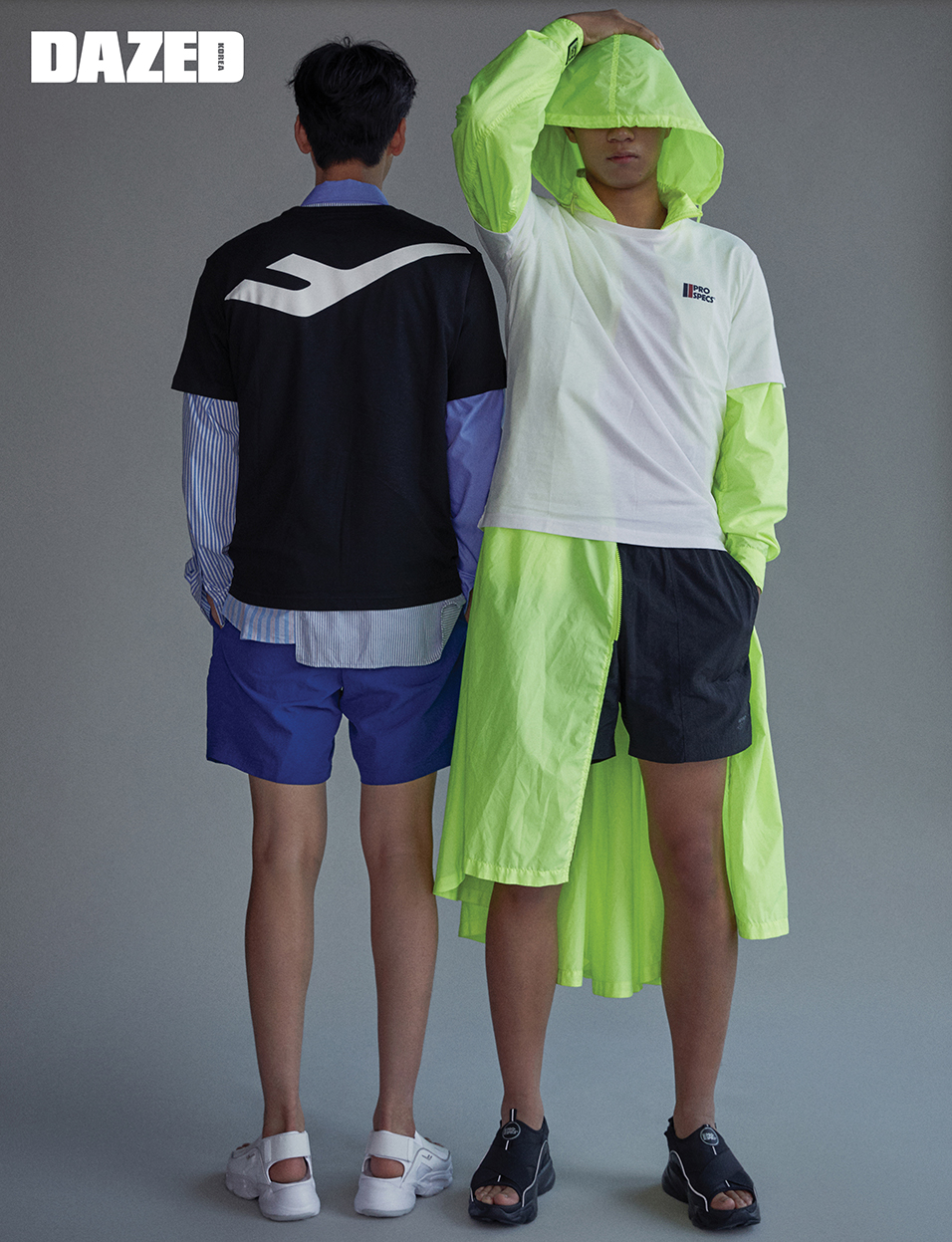 태양이 입은 블랙 빅 로고 티셔츠와 블루 쇼트 팬츠, 화이트 샌들은 모두 프로스펙스(Pro-specs), 이너로 입은 스트라이프 셔츠는 오디너리 피플(Ordinary People). 의진이 입은 화이트 티셔츠, 블랙 쇼트 팬츠, 블랙 샌들은 모두 프로스펙스(Pro-specs), 이너로 입은 네온 컬러 롱 윈드브레이커는 오프화이트(Off-White).