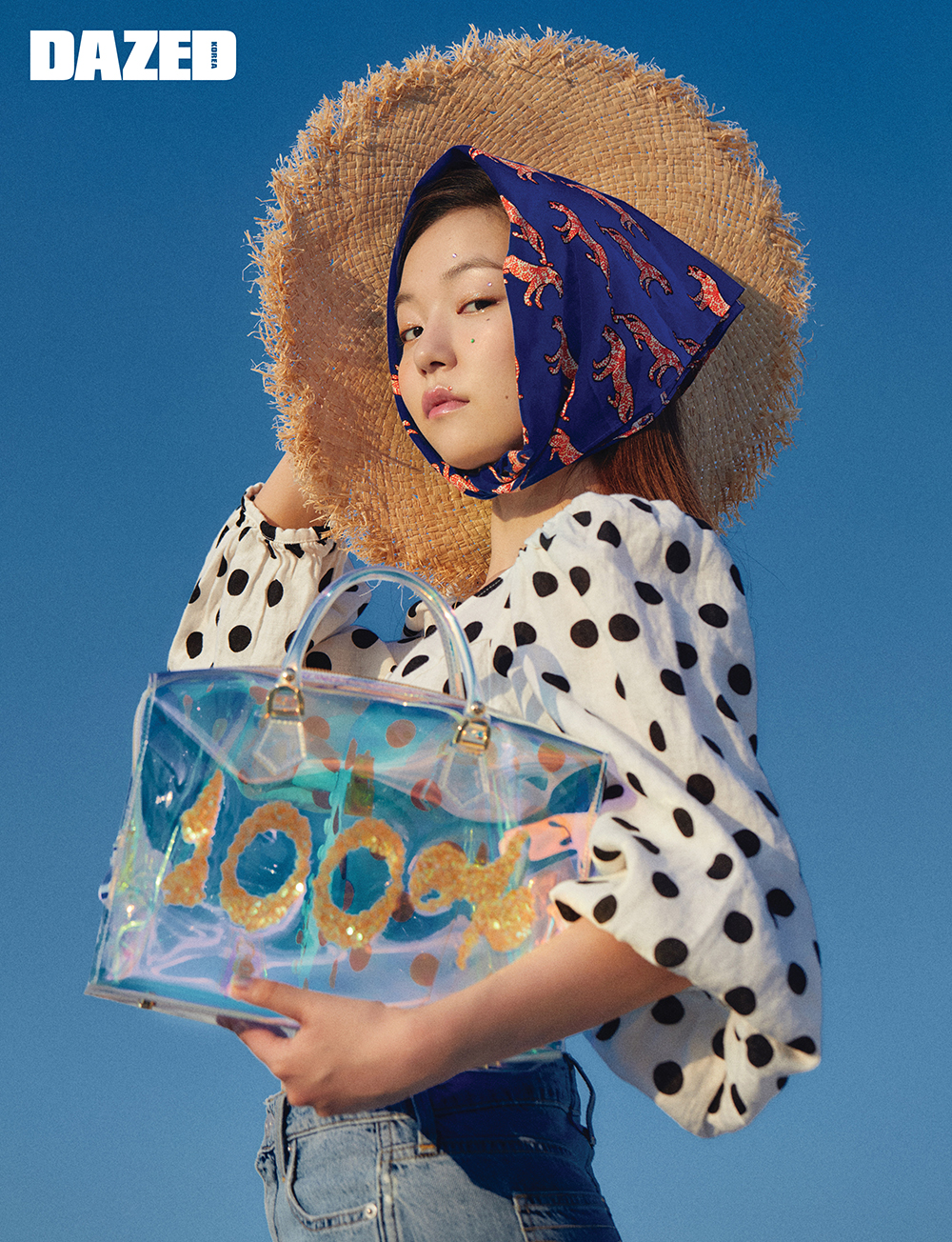 100%의 빛을 머금은 듯 빛나는 레인보우 컬러의 PVC 보스턴백은 플레이노모어(Playnomore), 도트 블라우스와 파나마 해트는 H&M, 데님 스커트는 캘빈 클라인 진(Calvin Klein Jeans), 귀여운 표범 무늬 스카프는 앤아더스토리즈(& Other Stories).