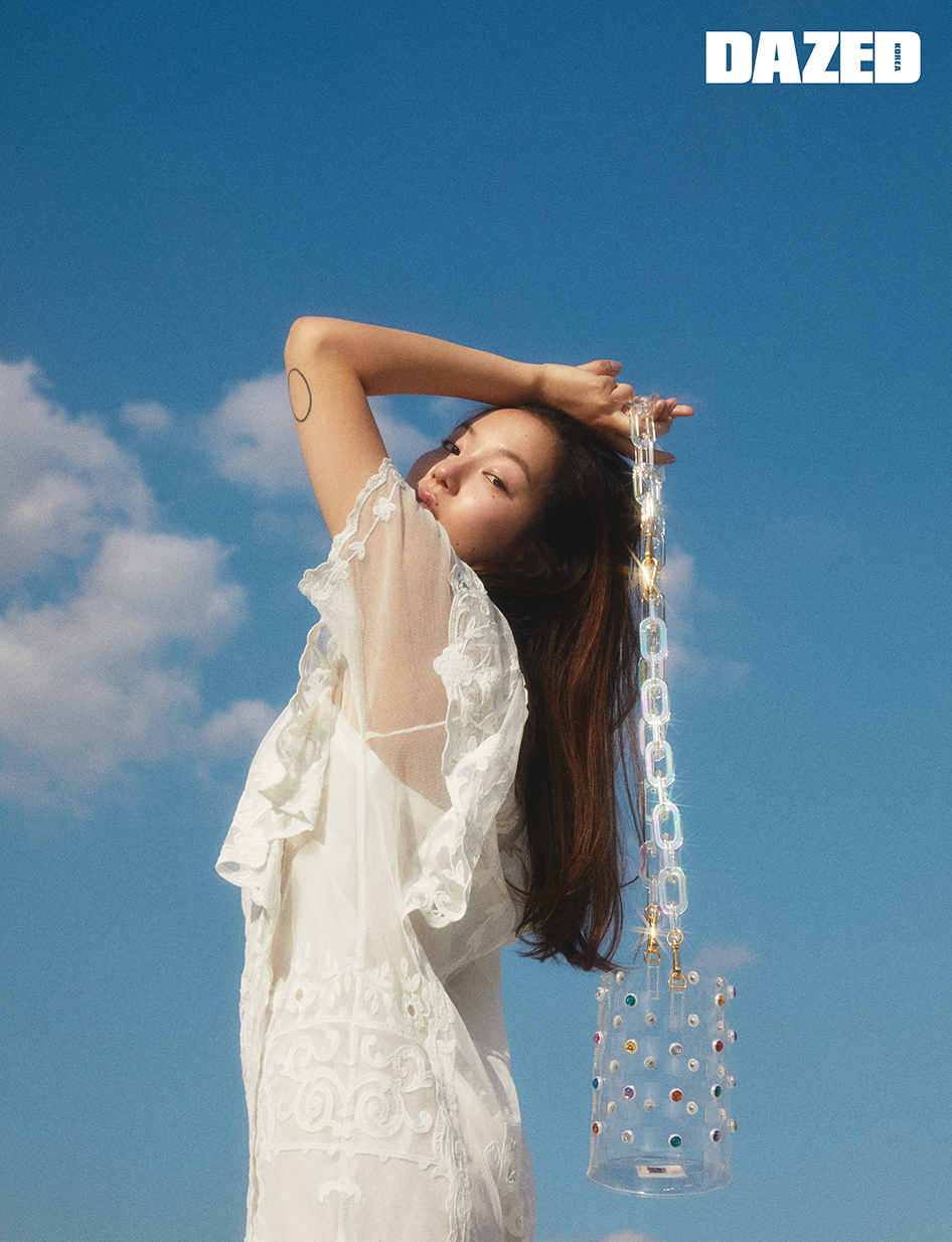 다양한 컬러의 보석이 하늘을 날아다니는 듯한 동화 같은 무드의 투명 PVC 버킷 백과 투명하면서도 은은한 오로라 컬러와 경계선 없이 세심하게 마감된 볼드한 형태의 아크릴 체인 백 스트랩은 플레이노모어(Playnomore), 원피스는 이자벨 마랑(Isabel Marant).
