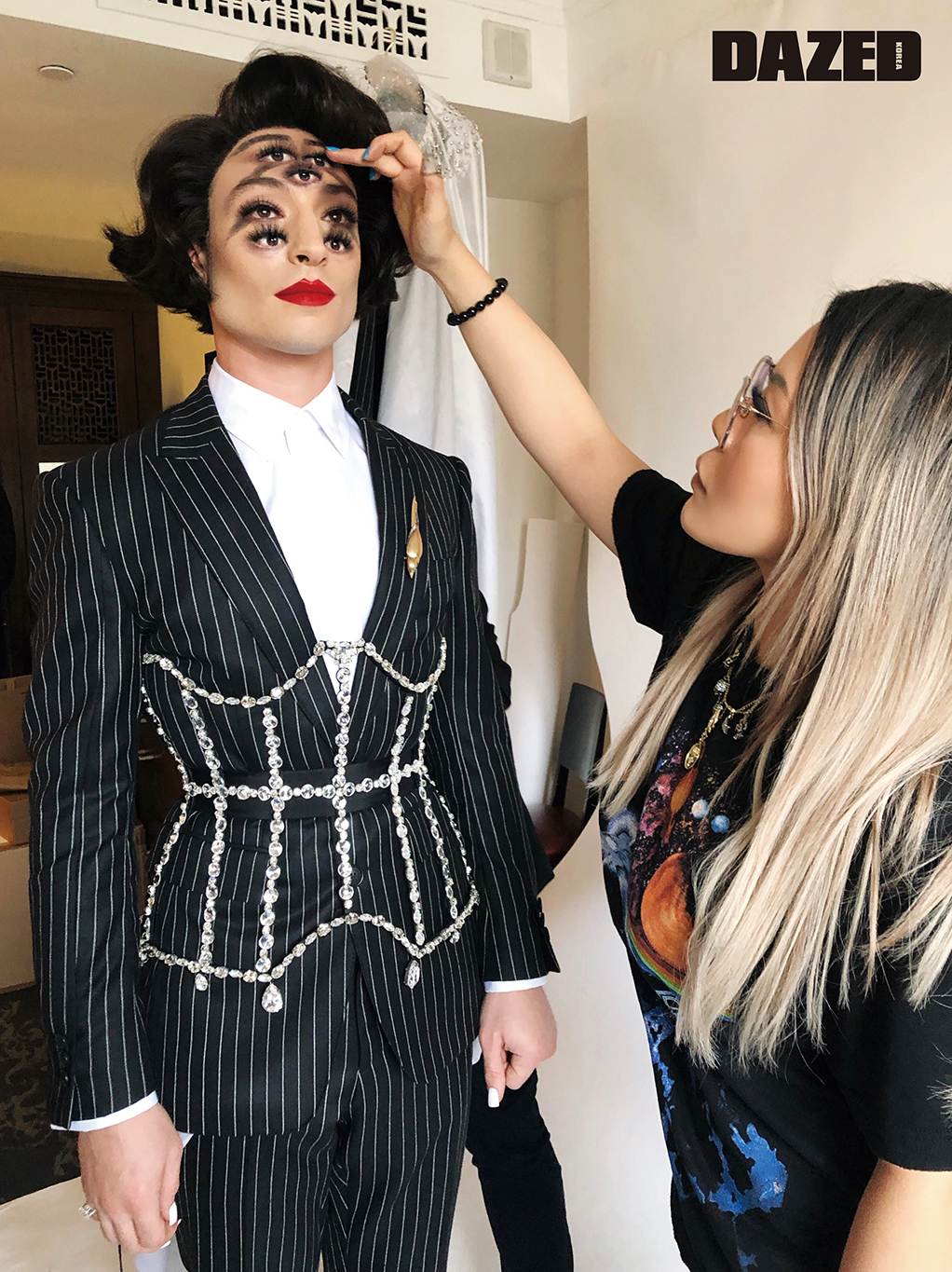 얼굴에 선반을 그린 작업을 가장 아낀다. 인생에서 중요하게 여기는 물건으로 선반을 가득 채웠는데, 완성하기까지 무려 10시간이 걸렸다. 최근 작업한 것 중에서는 2019년 멧 갈라 Met Gala에서 에즈라 밀러Ezra Miller가 선보인 메이크업인데, 내가 그녀의 이마에 그린 여러 개의 눈은 나만의 시그너 처이기도 하다.