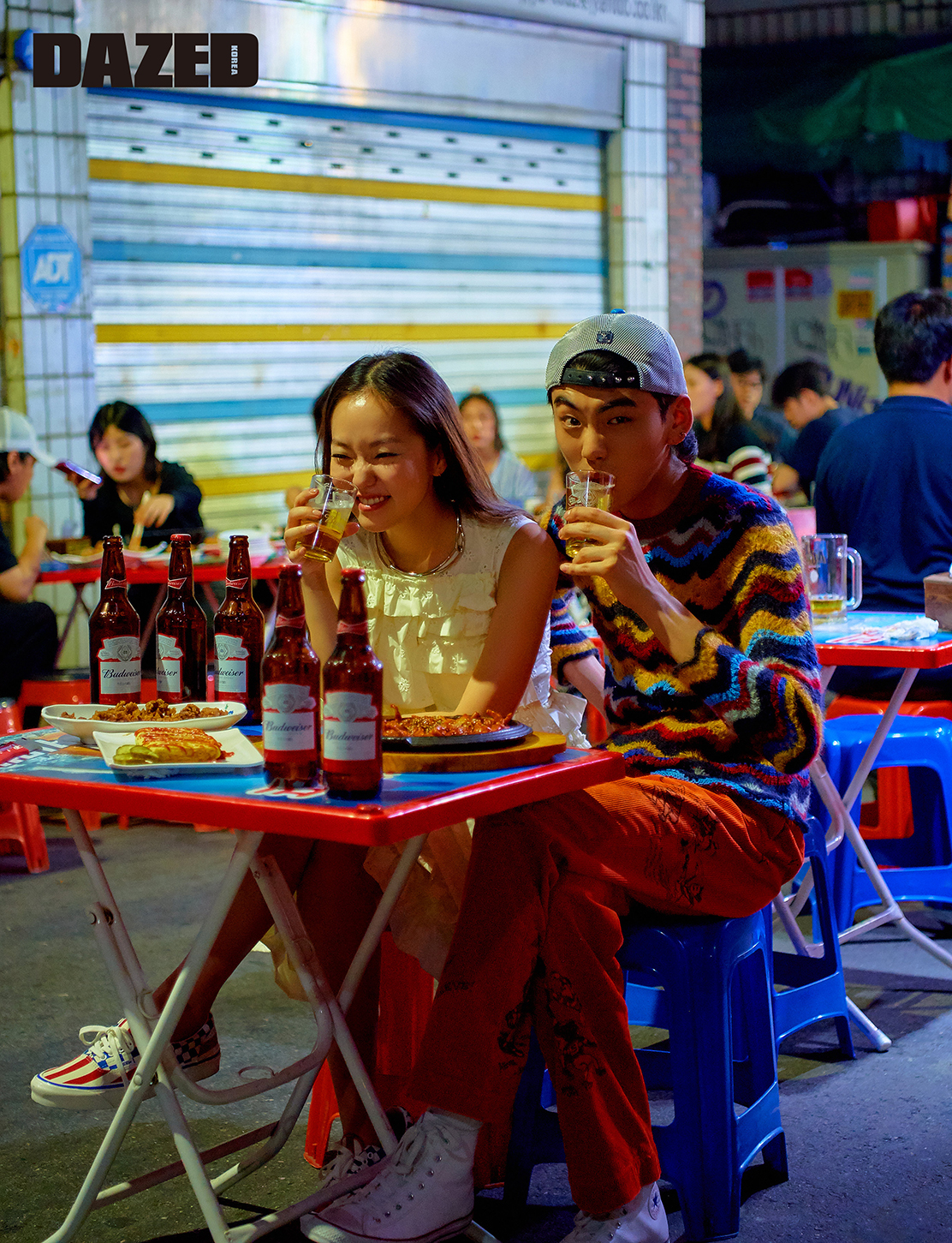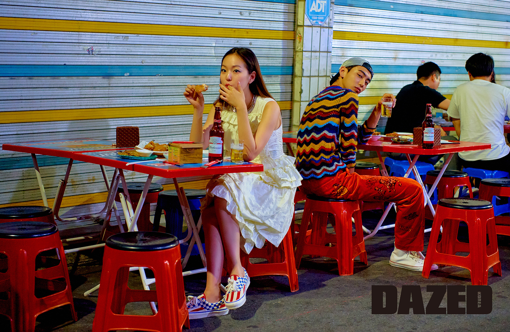 메구가 착용한 러플 미니드레스는 4 몽클레르 시몬 로샤(4 Moncler Simone Rocha), 스니커즈는 반스(Vans), 체인 목걸이는 캘빈 클라인(Calvin Klein). 준성이 착용한 물결무늬 니트 톱은 마르