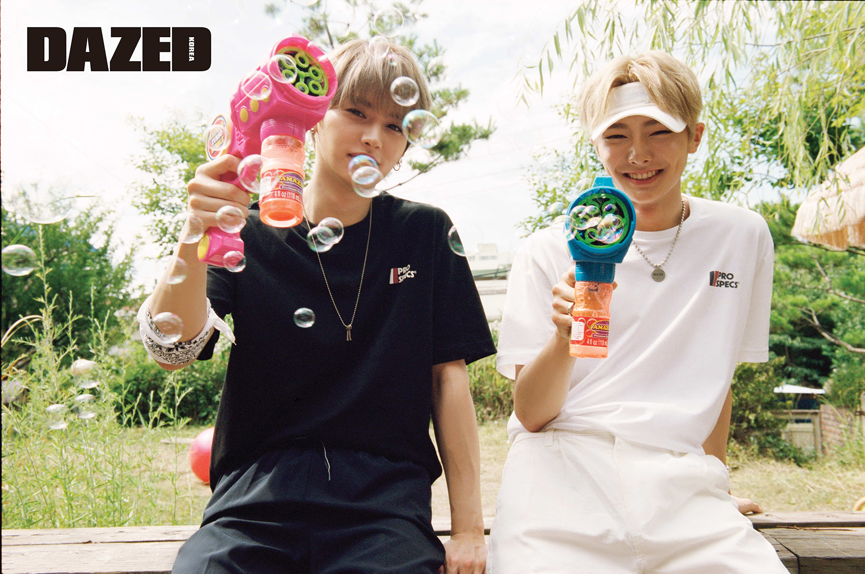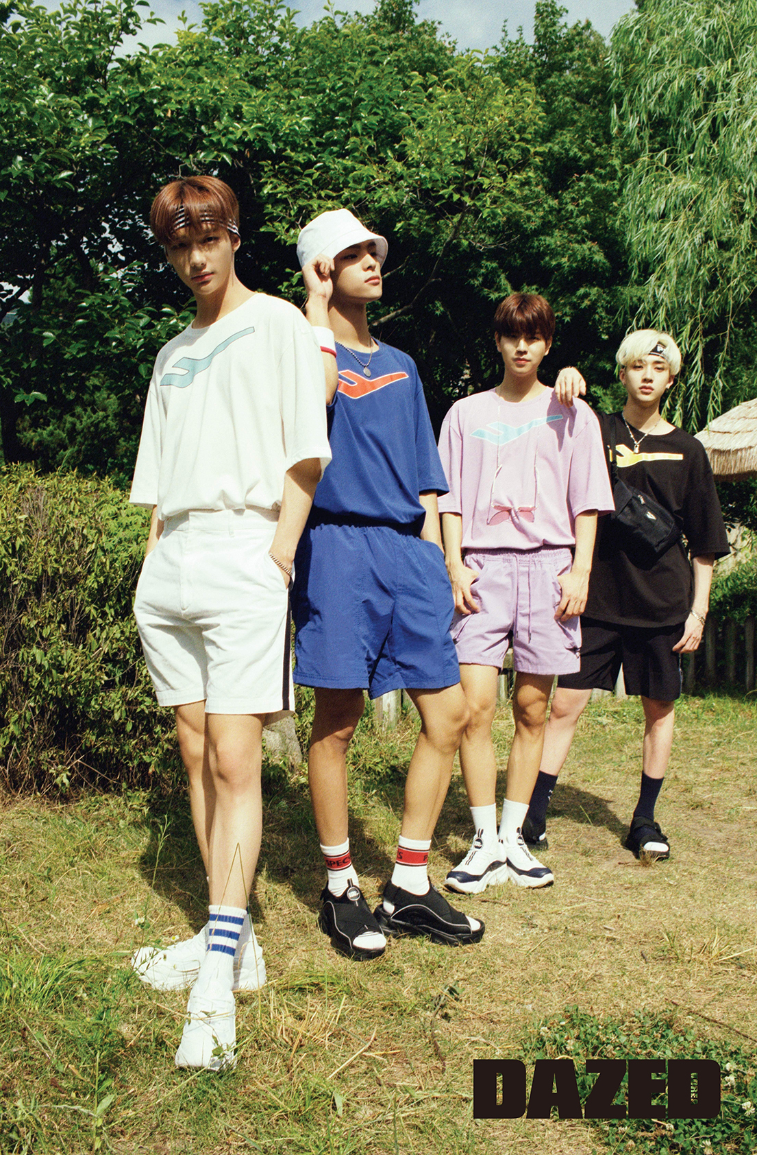 현진이 착용한 빅 로고 오버사이즈 티셔츠와 스택스뮬 101 스니커즈는 프로스펙스(Pro-specs), 쇼츠와 스트라이프 헤어밴드, 양말은 모두 스타일리스트의 것. 우진이 착용한 빅 로고 오버사이즈 티셔츠와 쇼츠, 암밴드, 양말, 스택스 샌들은 모두 프로스펙스(Pro-specs), 버킷 해트는 에비수(Evisu), 주얼리는 스타일리스트의 것. 승민이 착용한 빅 로고 오버사이즈 티셔츠와 레터링 양말, 스택스 111 스니커즈는 모두 프로스펙스(Pro-specs), 아웃포켓 쇼츠는 로맨틱크라운(Romantic Crown), 틴트 선글라스는 카린(Carin), 안경 스트랩은 마노모스(Manomos). 방찬이 착용한 빅 로고 오버사이즈 티셔츠와 쇼츠, 헤어밴드, 멀티플 크로스백, 화이트 포인트 양말, 샌들은 모두 프로스펙스(Pro-specs), 주얼리는 스타일리스트의 것.