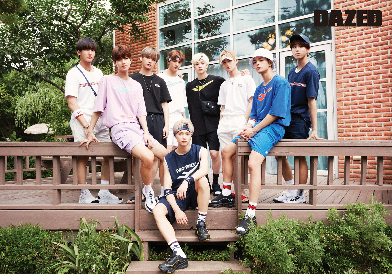 필릭스가 착용한 파이핑 디테일의 슬리브리스 톱과 쇼츠, 로고 장식의 헤어밴드와 암밴드, 양말, 스택스뮬 102 스니커즈는 모두 프로스펙스(Pro-specs), 이어링은 스타일리스트의 것. 창빈이 착용한 테이핑 로고 티셔츠와 멀티플 크로스백, 암밴드, 양말, 스택스 샌들은 모두 프로스펙스(Pro-specs), 화이트 쇼츠와 주얼리는 스타일리스트의 것. 승민이 착용한 빅 로고 오버사이즈 티셔츠와 레터링 양말, 스택스 111 스니커즈는 모두 프로스펙스(Pro-specs), 아웃포켓 쇼츠는 로맨틱크라운(Romantic Crown), 틴트 선글라스는 카린(Carin), 안경 스트랩은 마노모스(Manomos). 리노가 착용한 백 로고 프린트의 티셔츠와 쇼츠, 오리지널 슬리퍼는 모두 프로스펙스(Pro-specs), 주얼리와 팔에 묶는 스카프는 스타일리스트의 것. 현진이 착용한 빅 로고 오버사이즈 티셔츠와 스택스뮬 101 스니커즈는 프로스펙스(Pro-specs), 쇼츠와 스트라이프 헤어밴드, 양말은 모두 스타일리스트의 것. 방찬이 착용한 빅 로고 오버사이즈 티셔츠와 쇼츠, 헤어밴드, 멀티플 크로스백, 화이트 포인트 양말, 샌들은 모두 프로스펙스(Pro-specs), 주얼리는 스타일리스트의 것. 아이엔이 착용한 백 로고 프린트의 티셔츠와 오리지널 슬리퍼는 모두 프로스펙스(Pro-specs), 쇼츠와 선바이저, 주얼리는 모두 스타일리스트의 것. 우진이 착용한 빅 로고 오버사이즈 티셔츠와 쇼츠, 암밴드, 양말, 스택스 샌들은 모두 프로스펙스(Pro-specs), 버킷 해트는 에비수(Evisu), 주얼리는 스타일리스트의 것. 한이 착용한 테이핑 로고 티셔츠와 볼캡, 레터링 양말, 샌들은 모두 프로스펙스(Pro-specs), 데님 쇼츠와 벨트, 주얼리는 모두 스타일리스트의 것.