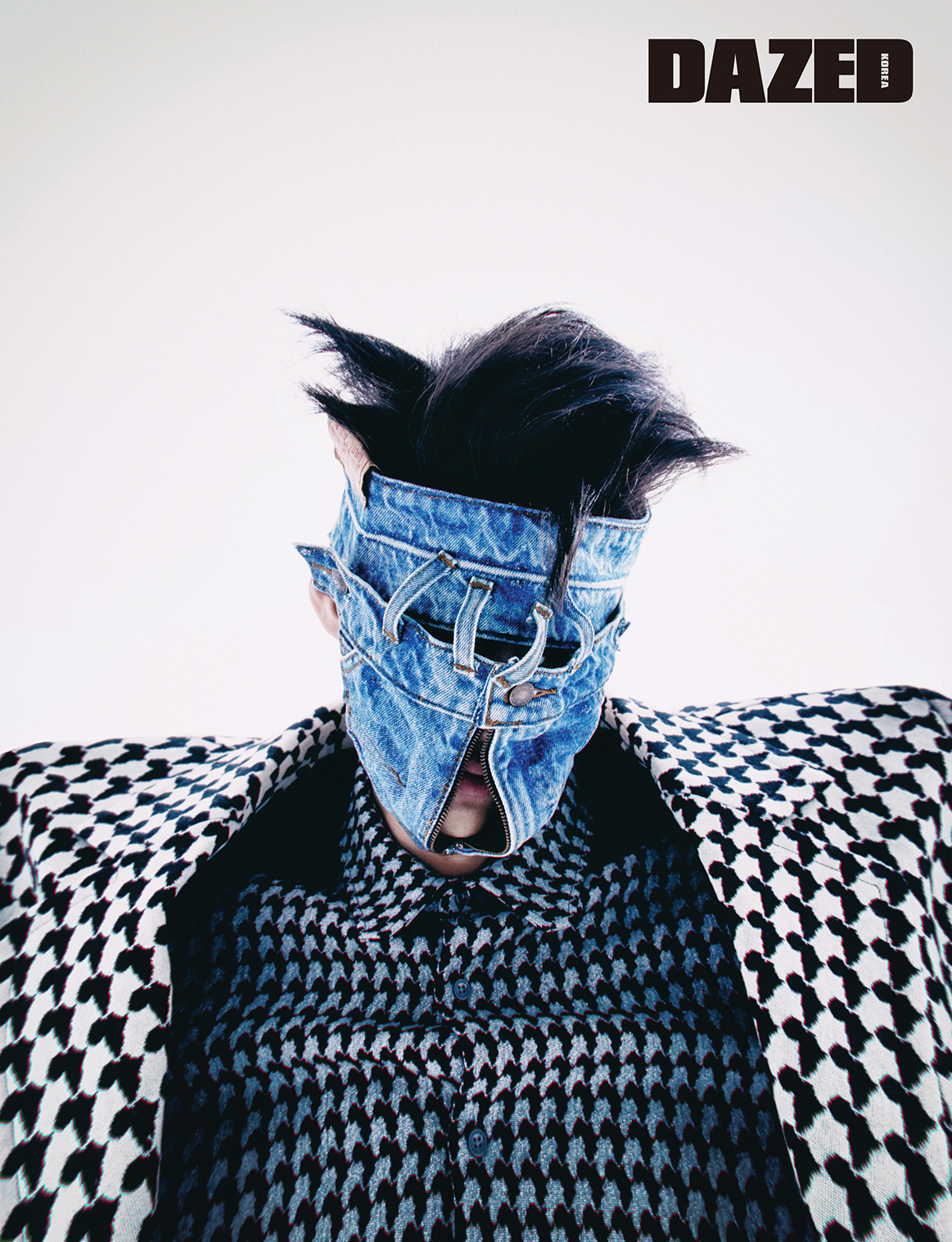 반복적인 기하학적인 무늬의 코트와 셔츠, 팬츠는 모두 루이 비통(Louis Vuitton), 데님으로 만든 헤드피스는 라즌(Rajn Atelier).