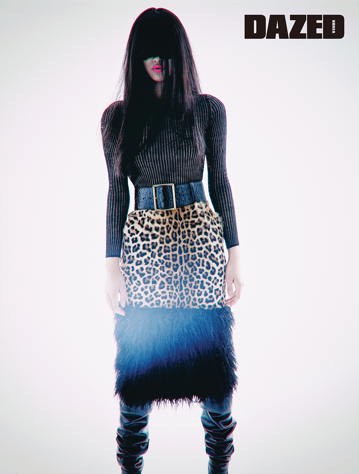 시스루 니트 톱과 퍼 장식 레오퍼드 무늬 펜슬 스커트, 와이드 벨트, 부츠는 모두 생 로랑 by 안토니 바카렐로(Saint Laurent by Anthony Vaccarello).