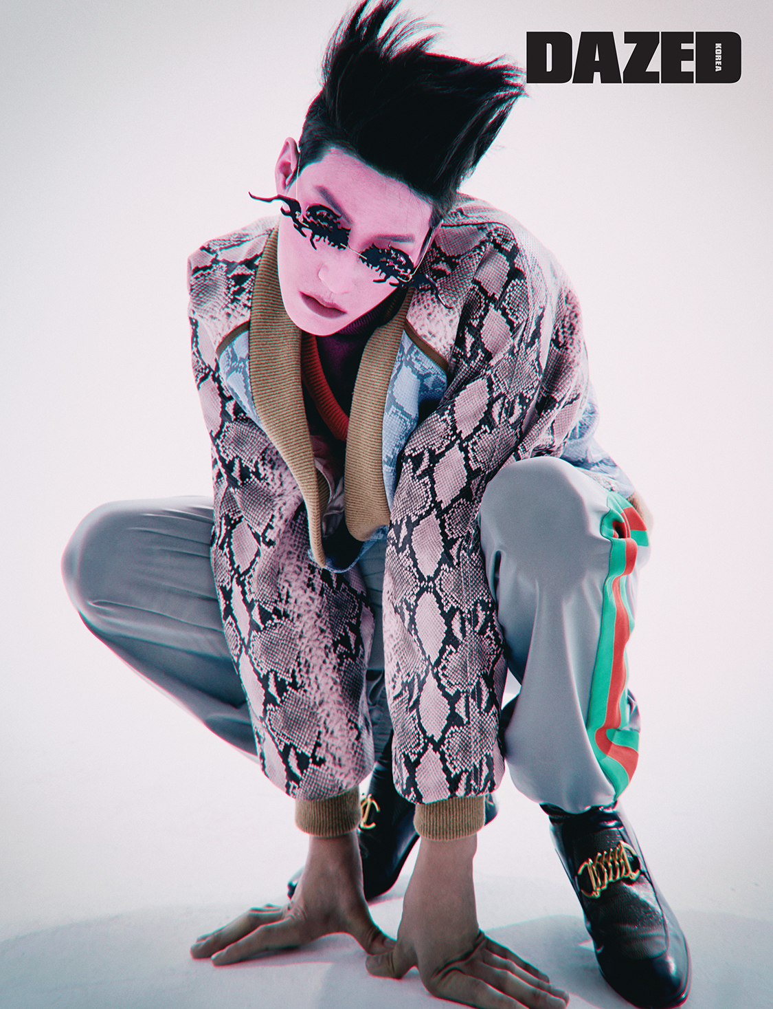 파이톤 무늬 보머 재킷과 이너로 입은 체크무늬 니트 베스트, 터틀넥 톱, 리플렉티브 소재로 만든 트랙 팬츠, 부츠는 모두 구찌(Gucci), 사마귀를 형상화한 아이웨어는 갓썸웨어(Godsomware).